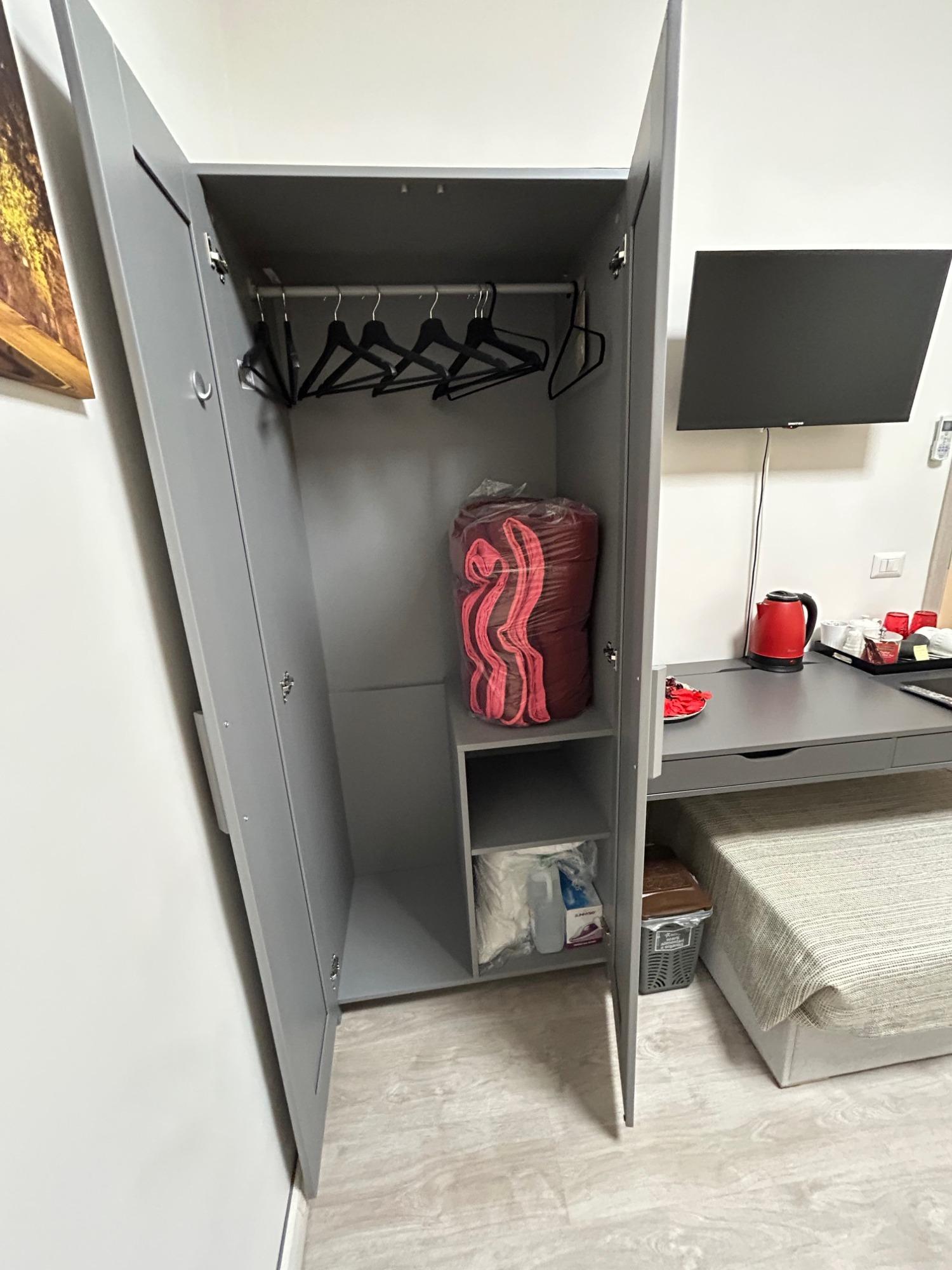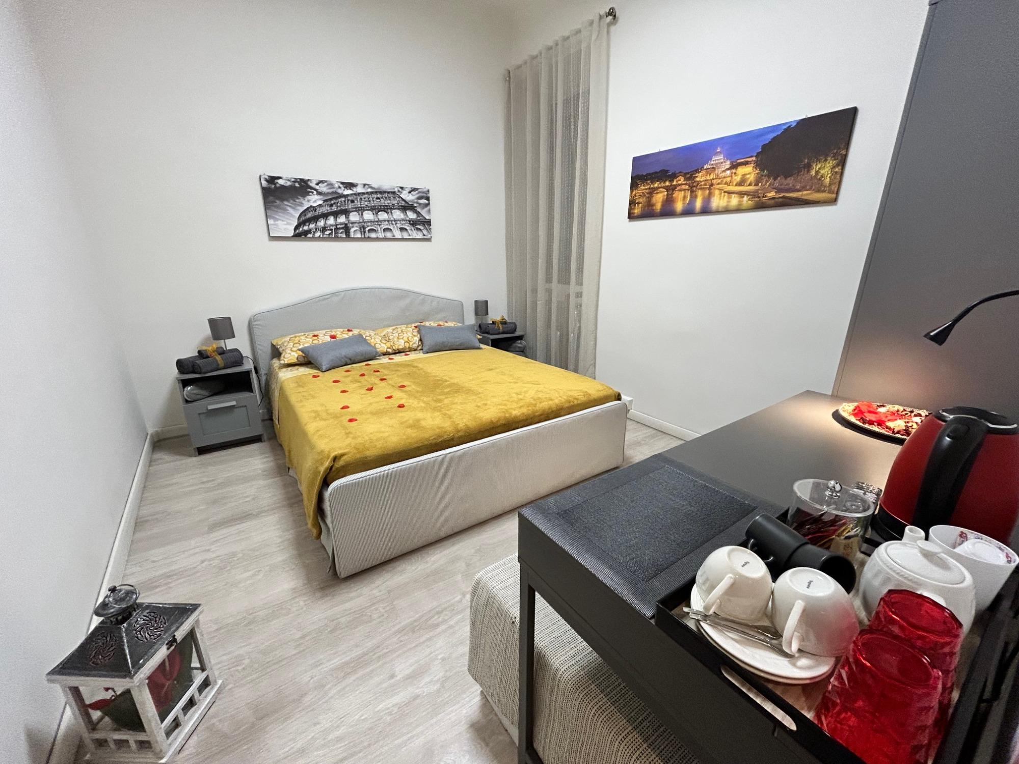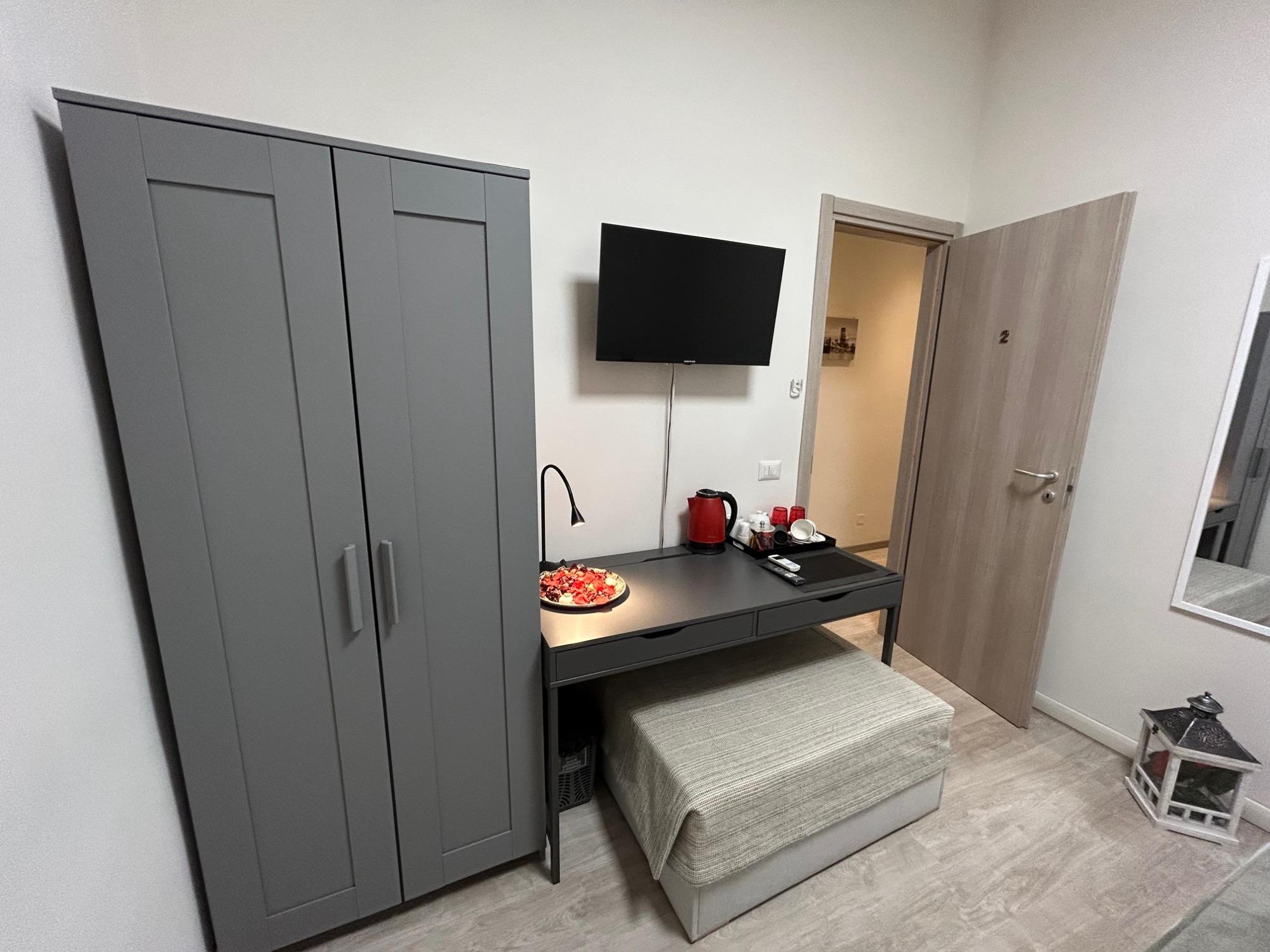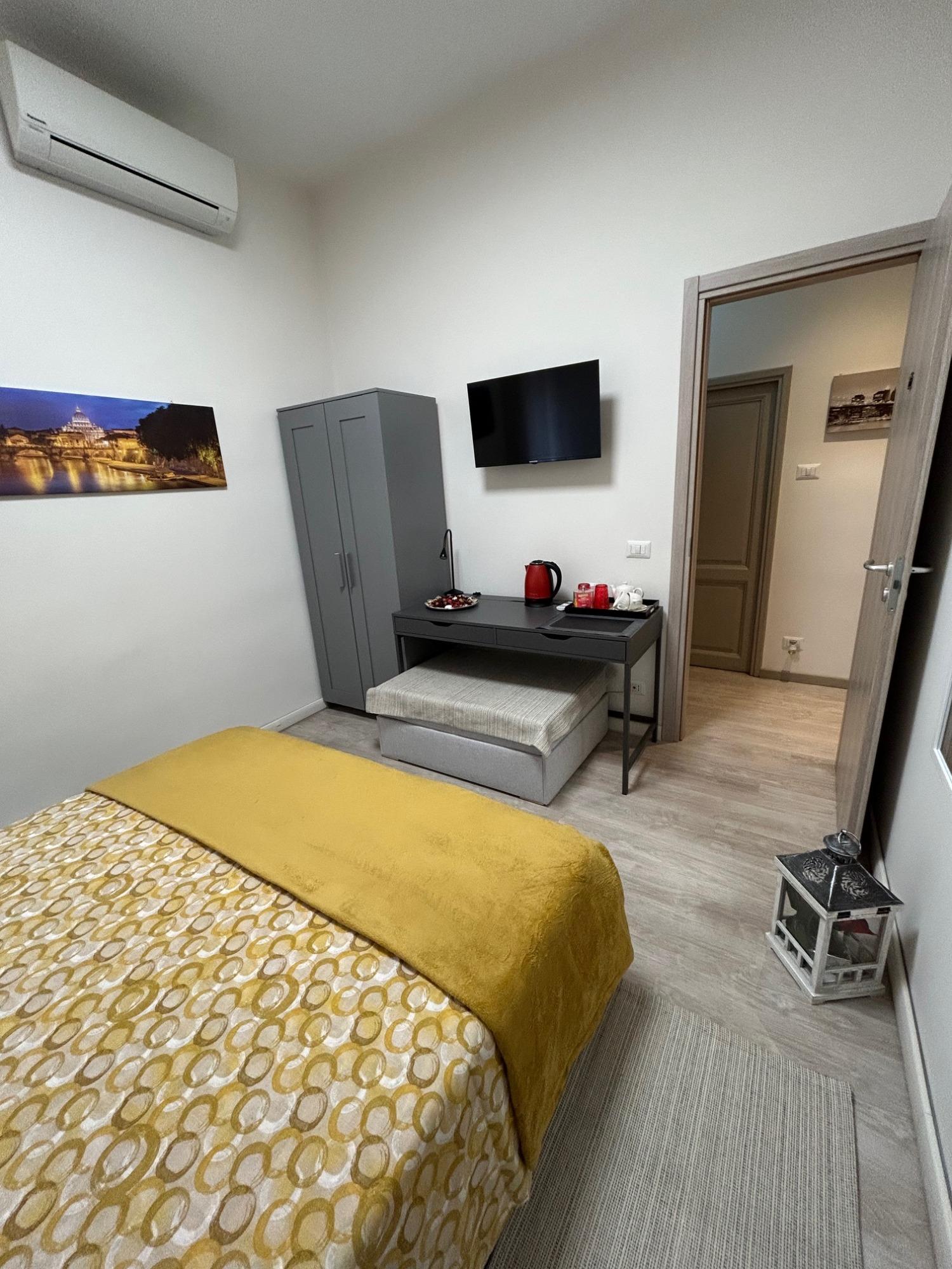 La camera, rinnovata negli arredi e curata nei dettagli, è climatizzata con aria condizionata e riscaldamento per garantire comfort in ogni stagione. Accogliente e ben organizzata negli spazi, dispone di letto matrimoniale con biancheria selezionata, armadio, scrivania, TV con accesso a Netflix e Prime Video, frigobar, bollitore con caffè e tisane, ferro da stiro e connessione Wi-Fi in fibra veloce gratuita. Su richiesta è possibile aggiungere rapidamente un terzo letto con supplemento.