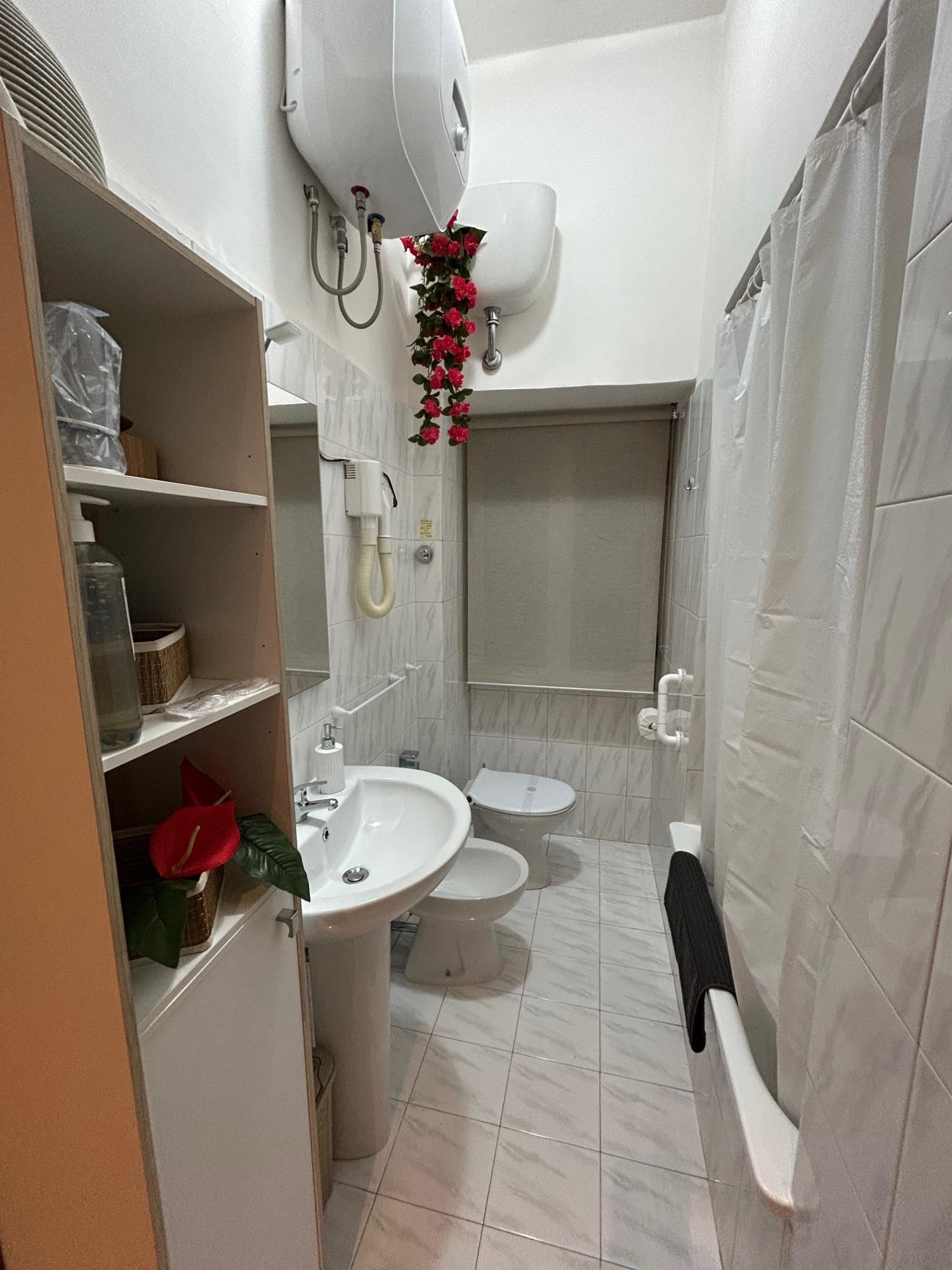 Il bagno privato è completo di vasca con doccia, bidet, asciugacapelli e dotazioni per l’igiene personale. Per ogni ospite sono forniti asciugamani e ciabatte personali, per un soggiorno pratico e confortevole.
