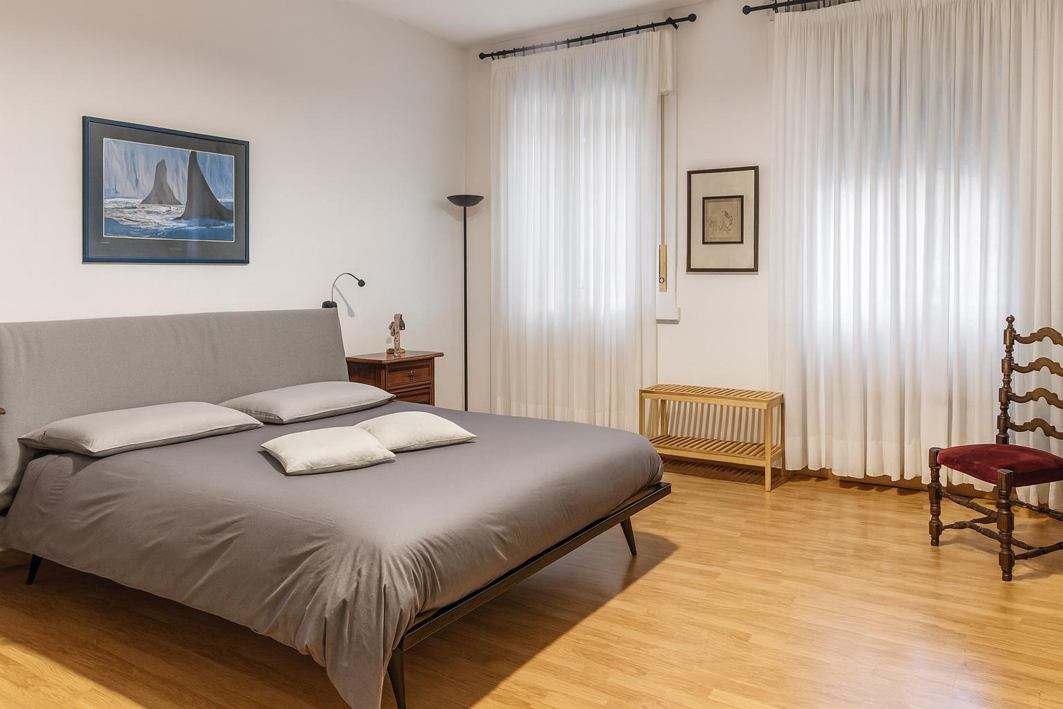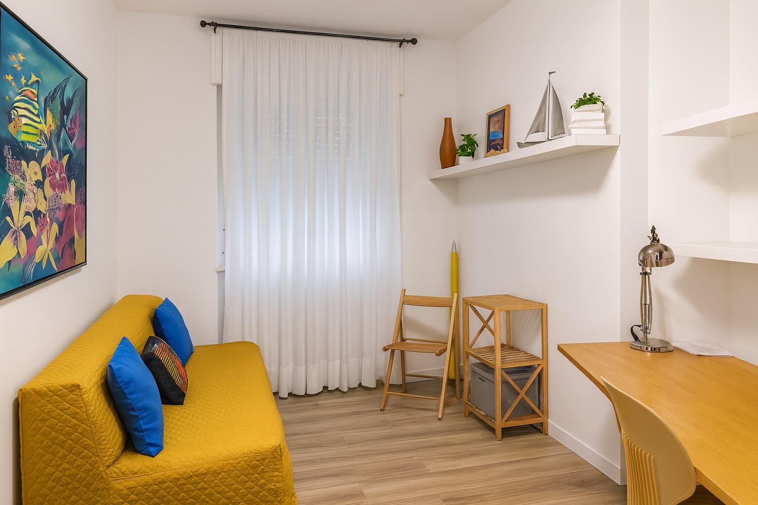 La camera matrimoniale è curata nei dettagli, mentre la seconda cameretta con scrivania rappresenta una soluzione preziosa per chi ha bisogno di lavorare o studiare in tranquillità.