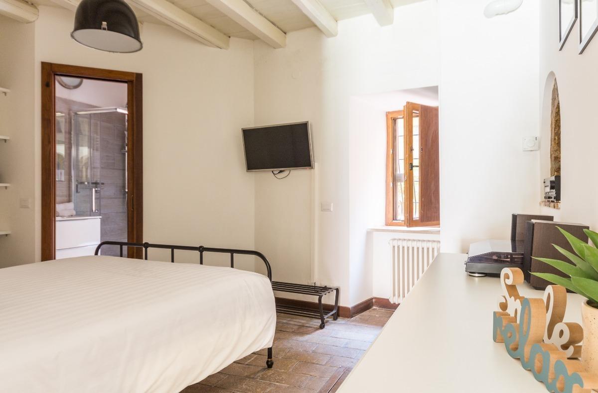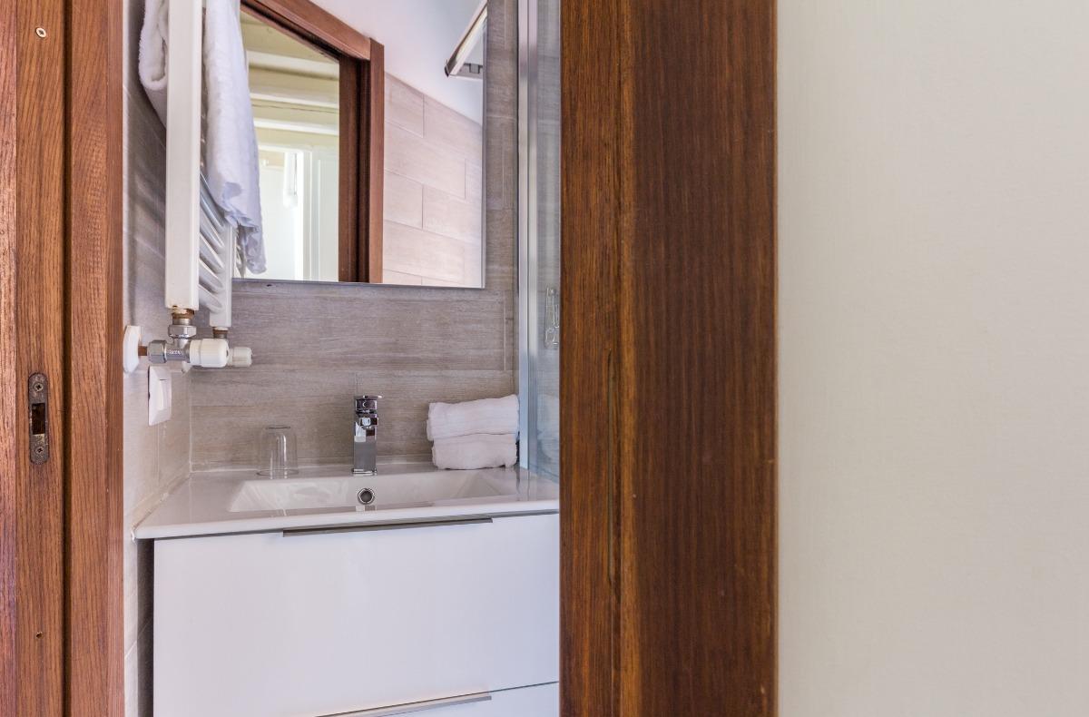 Un petit couloir mène à la chambre à coucher, équipée d'un lit double, d'une télévision, d'une armoire, d'une commode, d'un fer à repasser et d'une planche à repasser. Dans l'armoire de la chambre, il y a un petit placard avec un aspirateur, un seau et une serpillière pour le nettoyage des sols. La salle de bain, située dans la chambre à coucher, est moderne et dispose d'un lavabo, d'un WC, d'une douche et d'une sélection de produits de courtoisie tels que du shampoing, du gel douche et un bonnet de douche. Il n'y a pas de bidet, mais un robinet WC avec un jet d'eau est disponible.