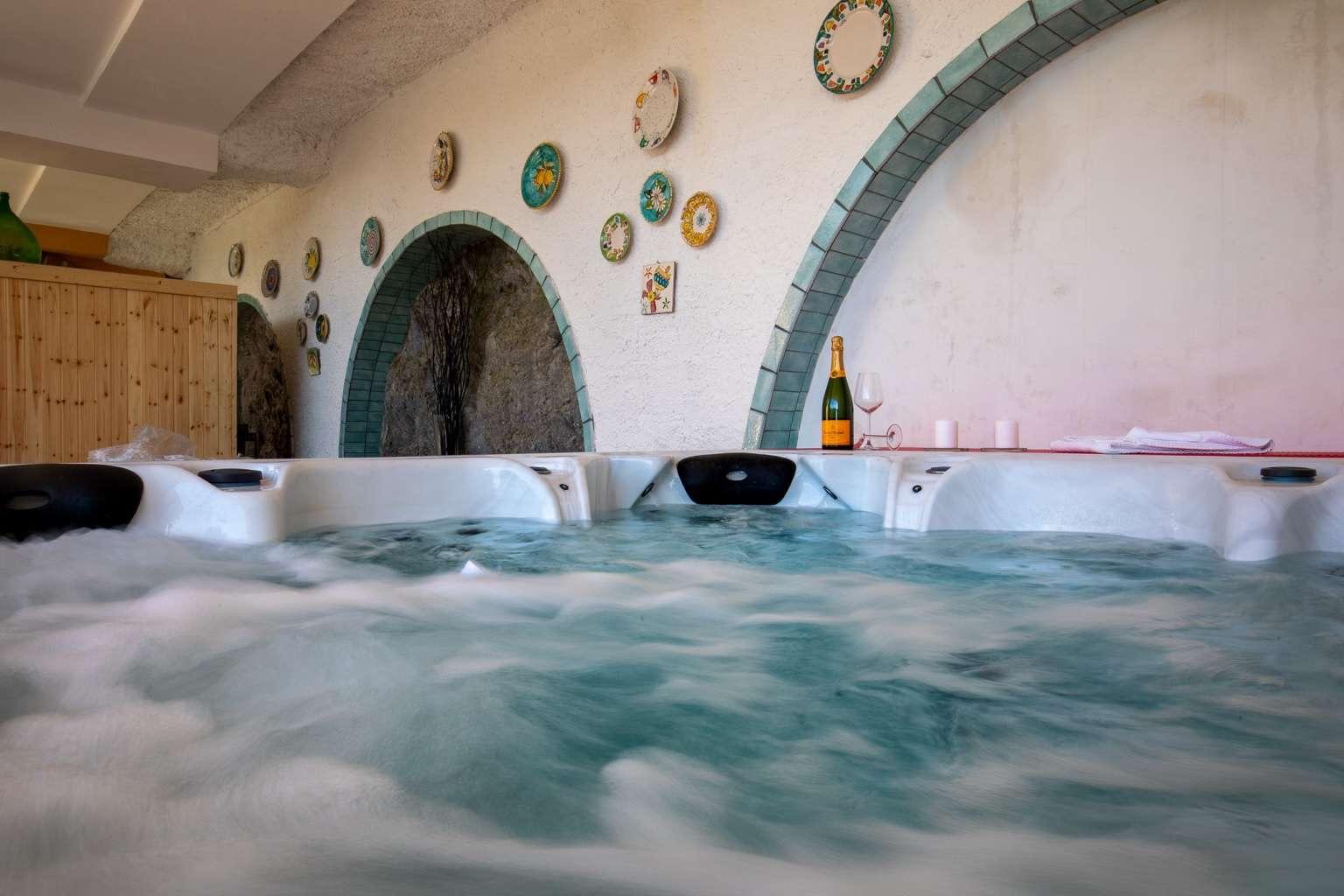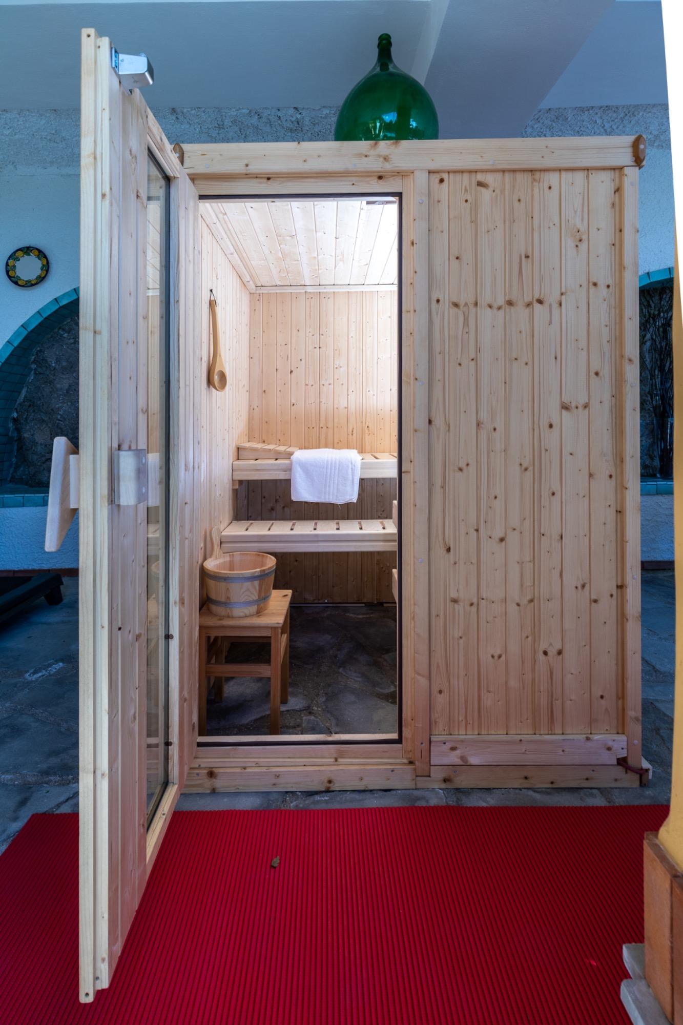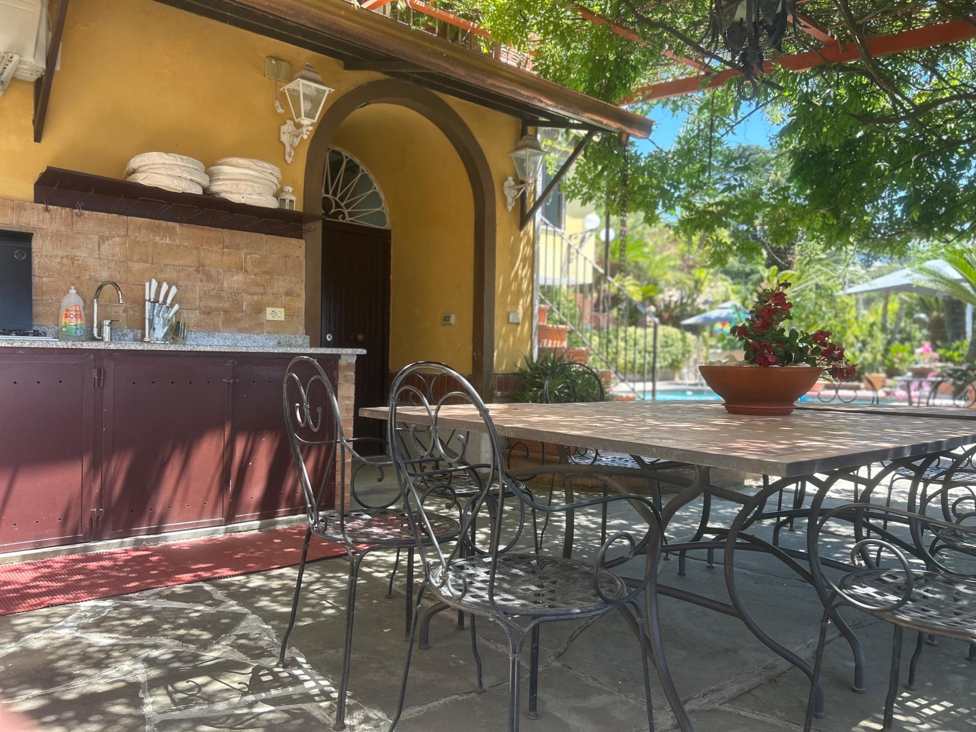 À l'extérieur, les invités peuvent profiter d'une cuisine équipée (utilisable par temps ensoleillé), d'un mini jacuzzi chauffé pour sept personnes, d'un sauna finlandais et d'une piscine en marbre de Carrare, accessible pendant la belle saison. Le parc, soigneusement entretenu et embelli par des plantes exotiques, constitue une oasis de paix et de bien-être.