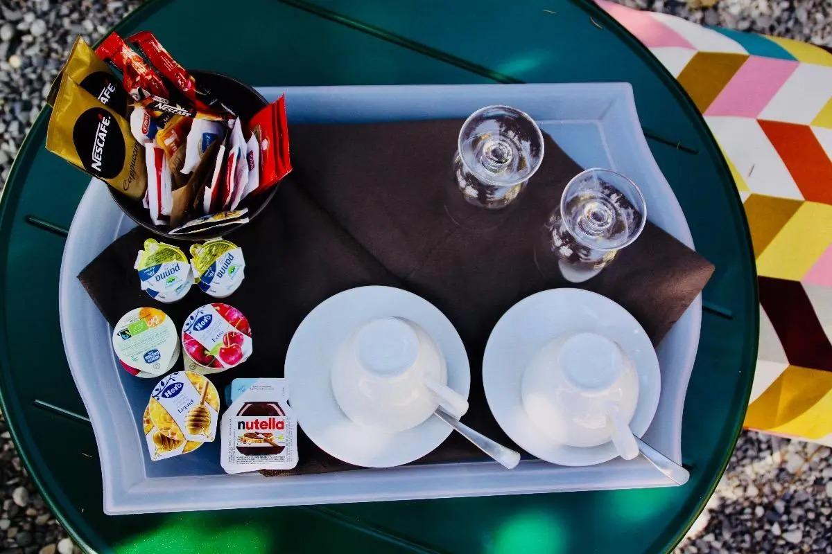 In Ihrer Unterkunft finden Sie eine bequeme Schale mit Kaffee und Pulverkakao, Tee und Zucker, Bio-Marmeladen und dem köstlichen Nutella.