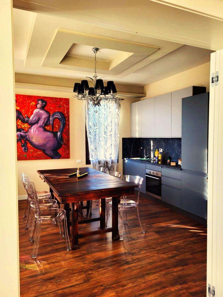 L'appartement peut accueillir jusqùà 9 personnes et est composé d'une cuisine équipée, avec toutes les commodités : réfrigérateur, congélateur, plaque à induction, four ventilé, micro-ondes, lave-vaisselle, bouilloire électrique, presse-agrumes, grille-pain. Il y a aussi une chaise haute pour les tout-petits.