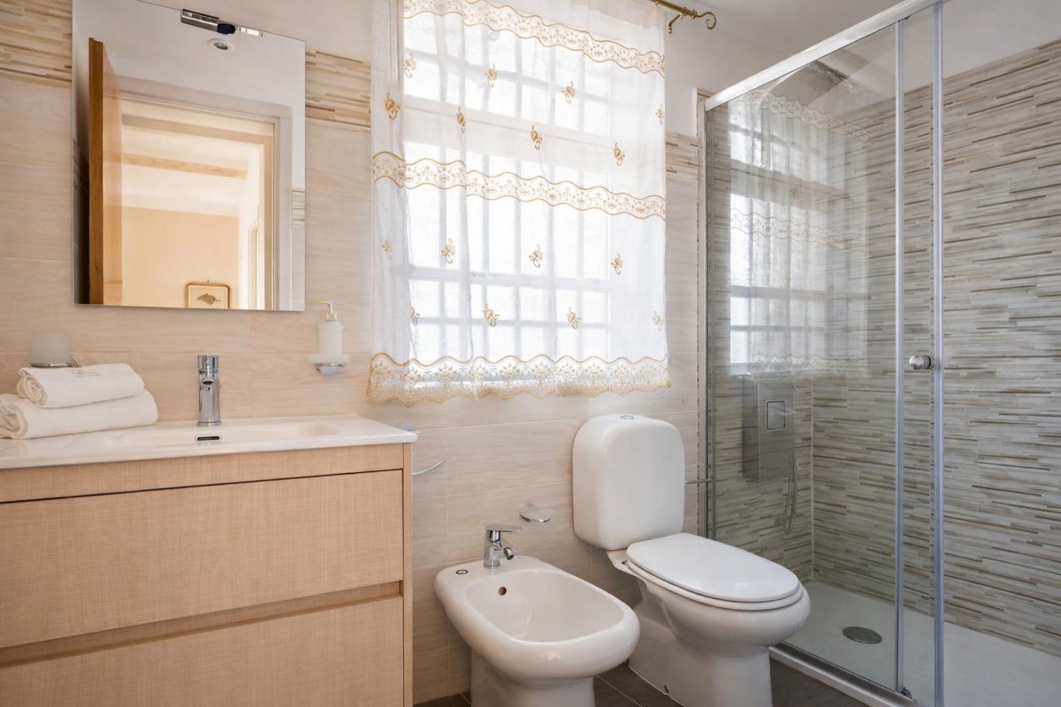 Im Inneren der Villa finden Sie eine Reihe von gut eingerichteten Zimmern mit modernem Komfort. Ein klimatisiertes Doppelzimmer bietet einen entspannenden Blick auf den Garten, während ein kürzlich renoviertes Badezimmer Luxus und Komfort bietet, einschließlich einer Duschkabine mit Whirlpoolstrahl und farbigen LED-Leuchten für emotionale Farbtherapie. Ein zweites Zimmer verfügt über zwei Einzelbetten, einen Schreibtisch und einen 32-Zoll-LCD-Fernseher, während die kombinierte Küche und Wohnzimmer eine gemütliche Umgebung mit einem Schlafsofa für eineinhalb Personen, einem 32-Zoll-LCD-Fernseher und Klimaanlage bieten. Die Küche ist komplett ausgestattet mit allem, was Sie brauchen, inklusive Elektroherd, Mikrowelle, Herdplatte, Kühlschrank mit Gefrierfach, Kaffeemaschine, Wasserkocher und einer Auswahl an Kräutertees für die Gäste. Außerdem finden Sie alle notwendigen Geschirr, Besteck und Töpfe, um Mahlzeiten zuzubereiten. Eine Waschmaschine steht zu Ihrem Komfort zur Verfügung, zusammen mit Hygieneprodukten und Reinigungsmitteln für die tägliche Reinigung.