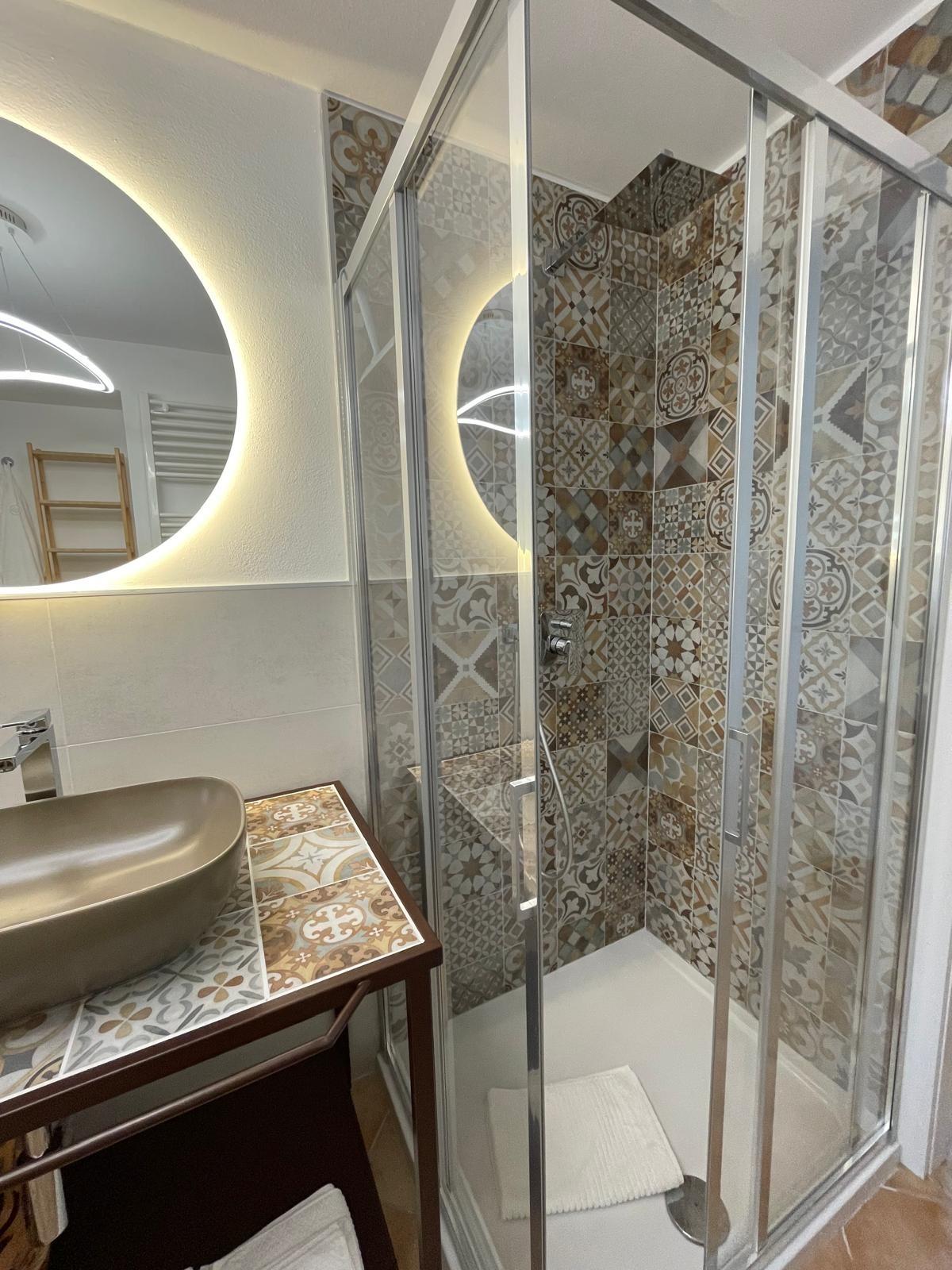 Chambre double avec possibilité d'ajouter un lit bébé, salle de bain privée, cuisine équipée et jardin privé clôturé avec coin repas extérieur.