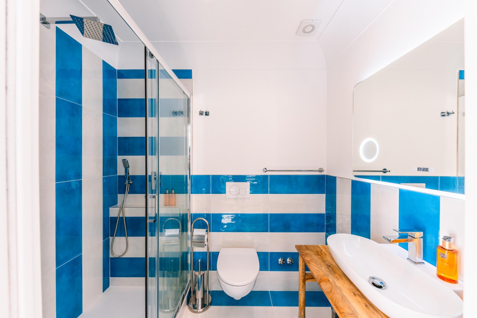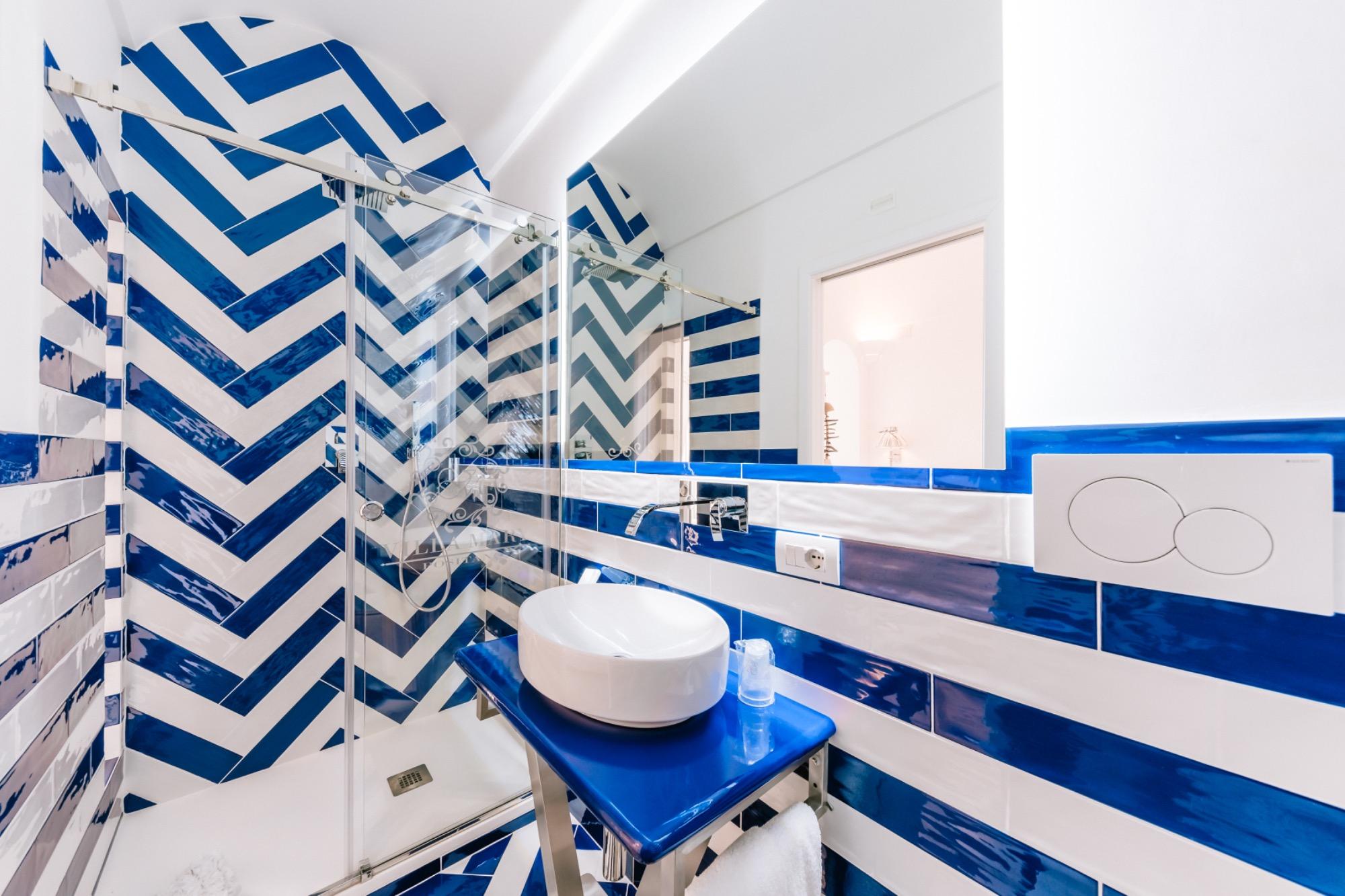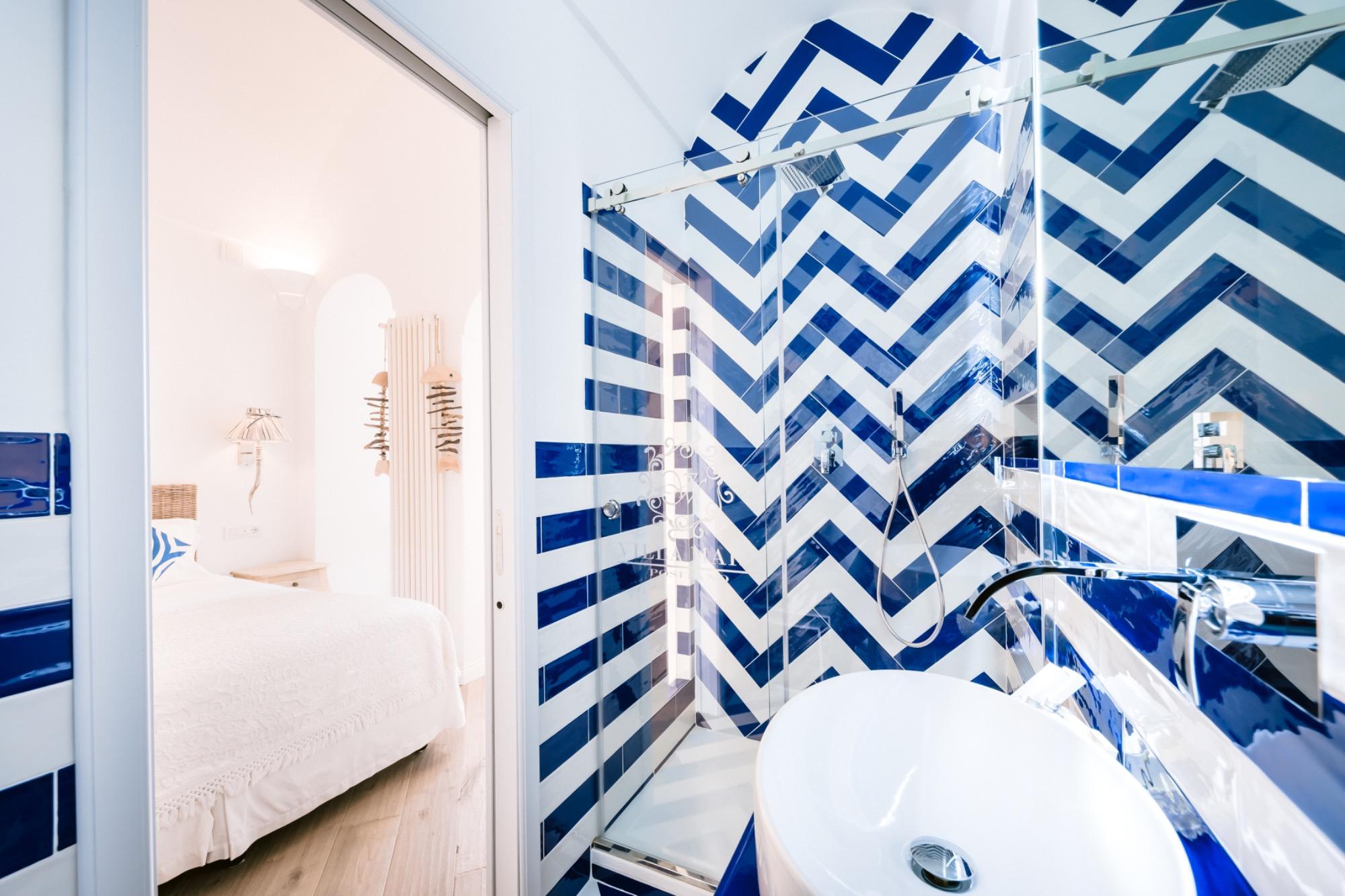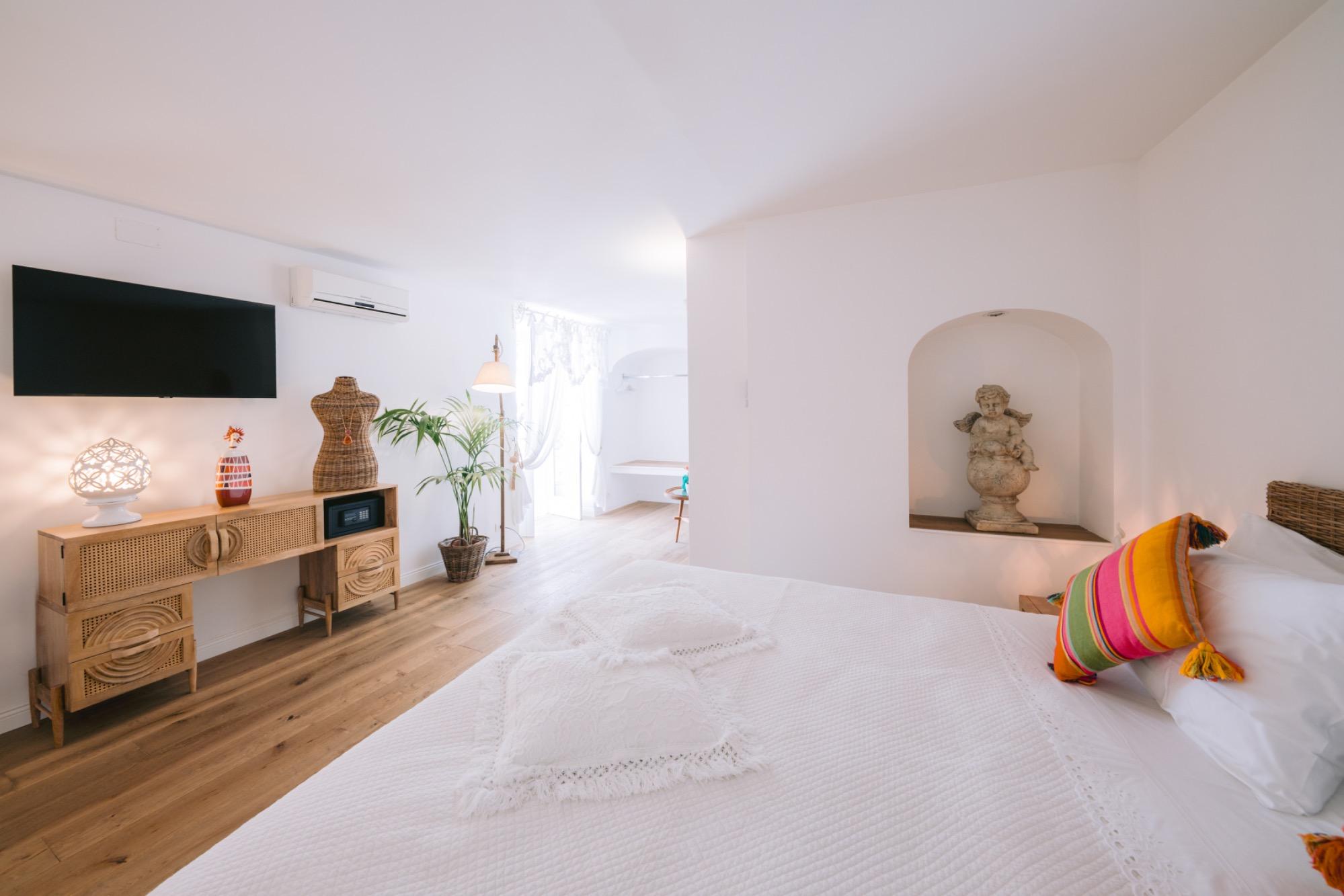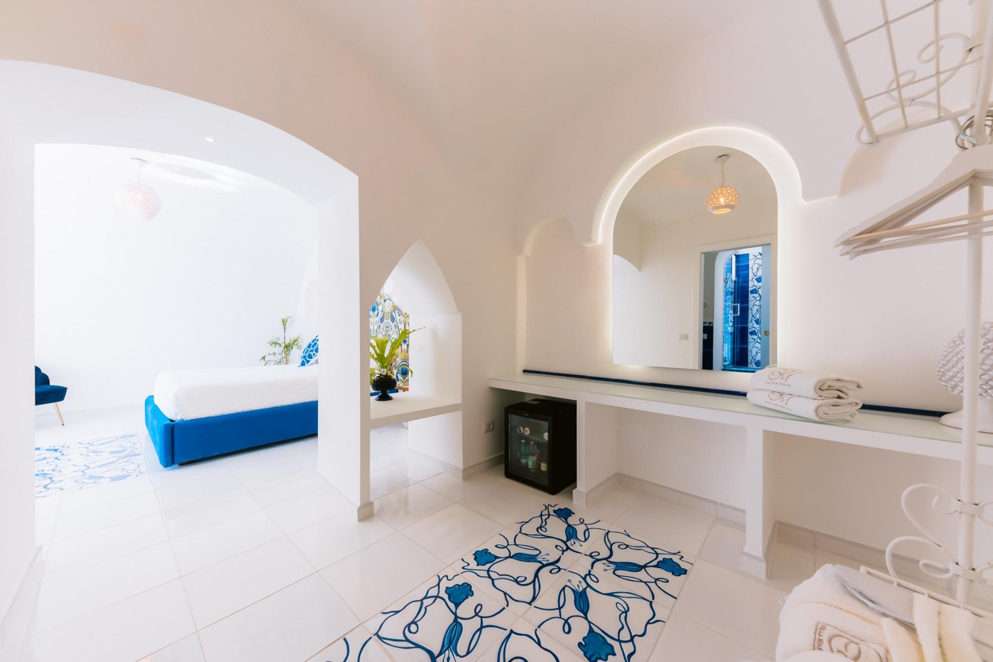 Certainly, here's the corrected version in English: "The pure white and the blue of the Tyrrhenian Sea merge to breathe life into a suite crafted from precious materials, entirely hand-modeled by the skillful local artisans. This suite is the result of the meticulous restoration of a 19th-century building, characterized by its arches and vaults, and it boasts a private panoramic terrace that overlooks the iconic pyramid of Positano, gracefully descending into the crystal-clear waters of the Amalfi Coast. This generously sized suite offers a luminous space, complete with a dressing room, and an enchanting bathroom featuring a panoramic shower."