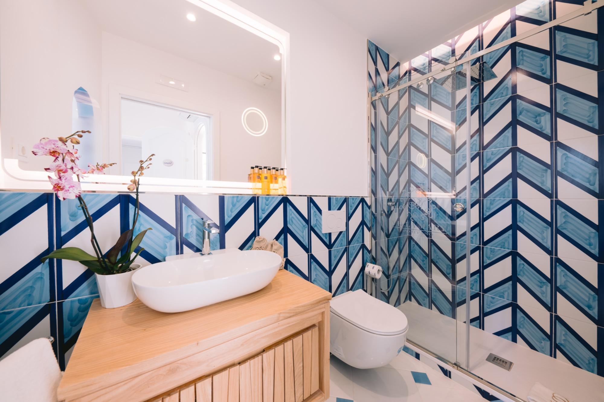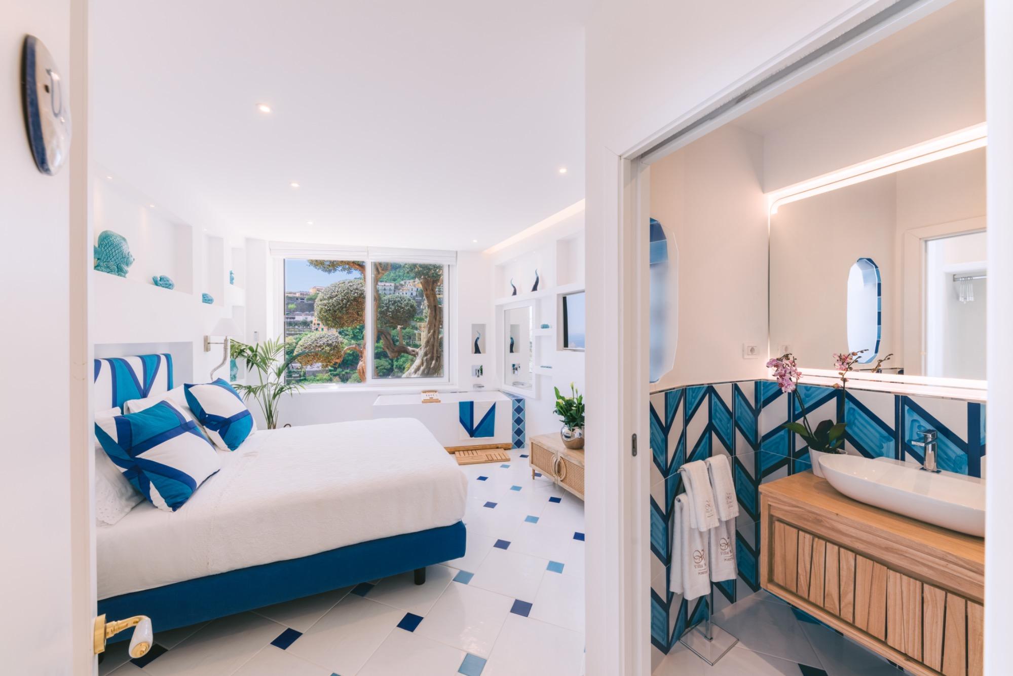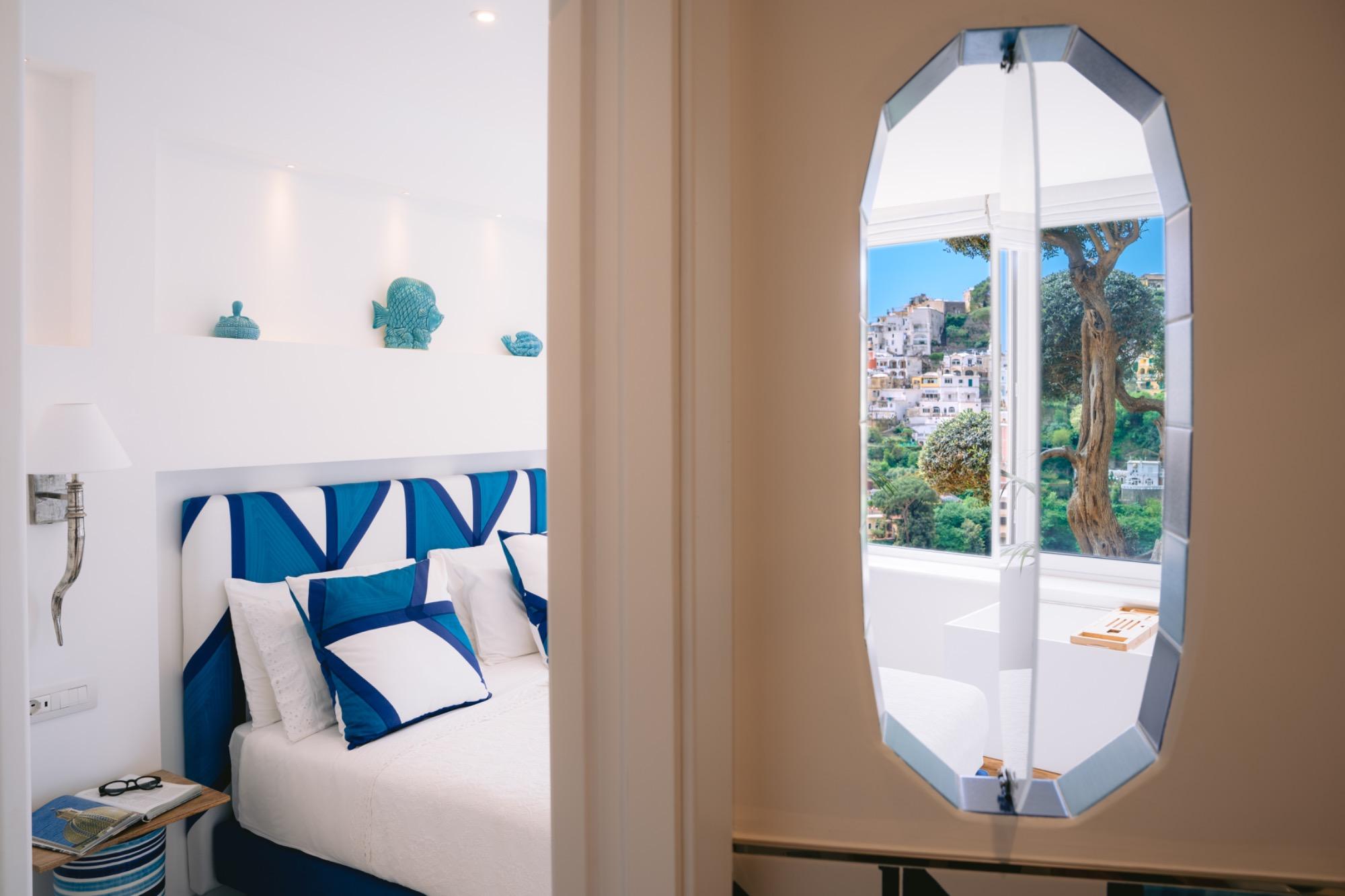 The pure white, combined with the colors of the Positano sea, creates a harmony that enhances the craftsmanship of the materials used to create this room. A huge window opens onto a unique view of Positano’s pyramid, offering a breathtaking panorama of the colors of the “Vertical City” and the horizon, to be admired even while enjoying a fine drink in the panoramic bathtub. The room also offers various services, such as free Wi-Fi, Air Conditioning, OLED TV, and much more! Our reception will strive to satisfy your every request!