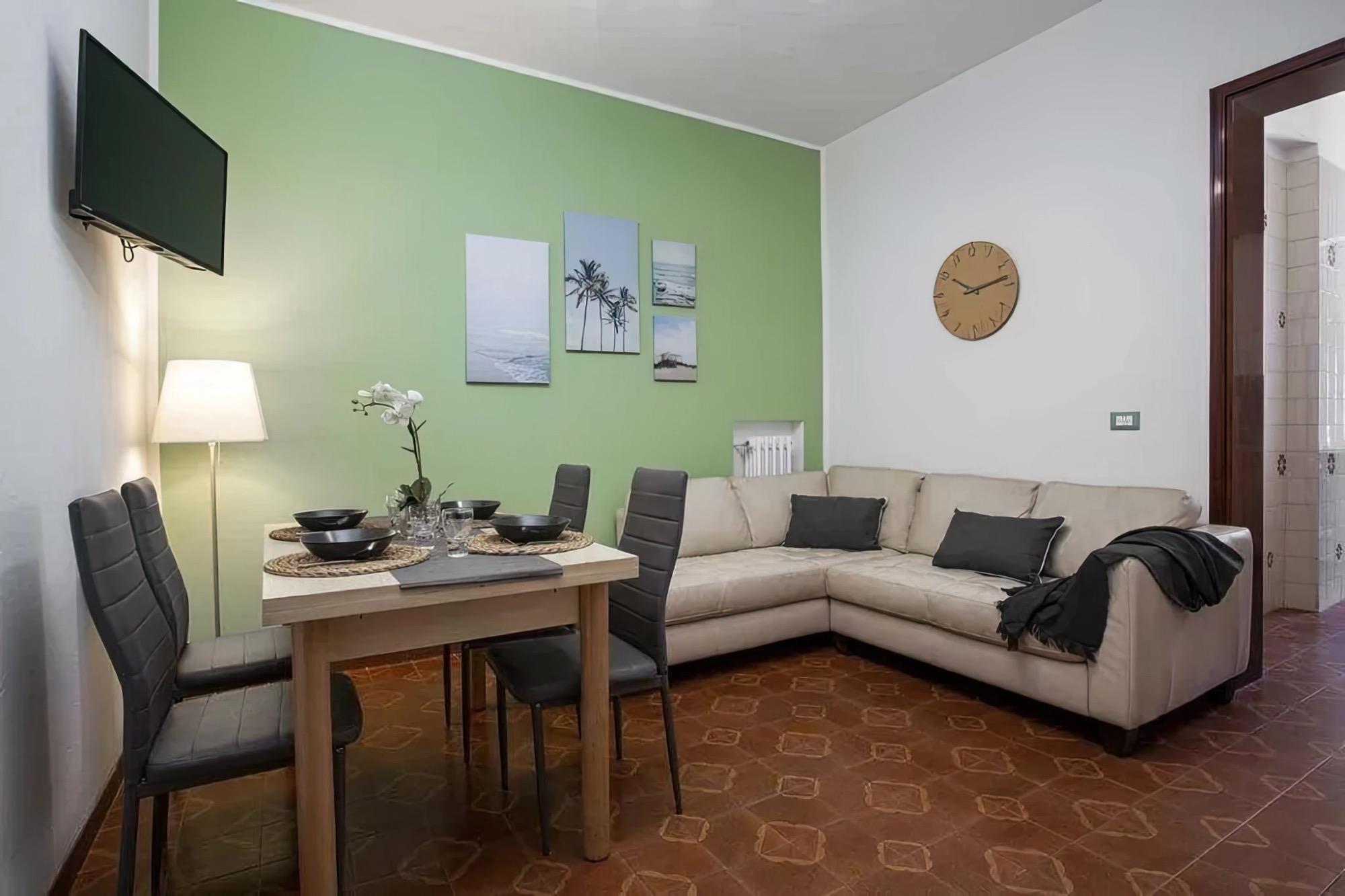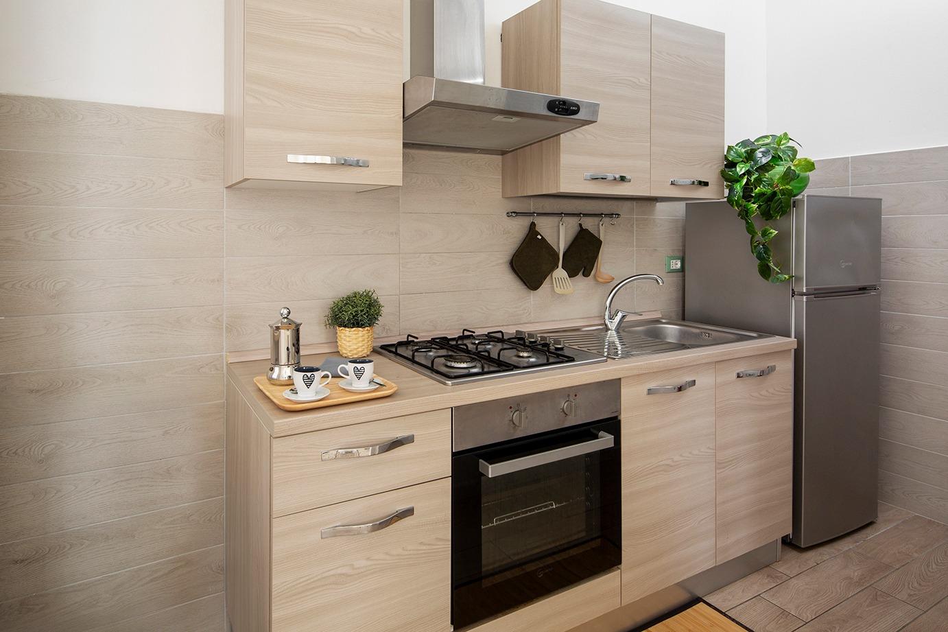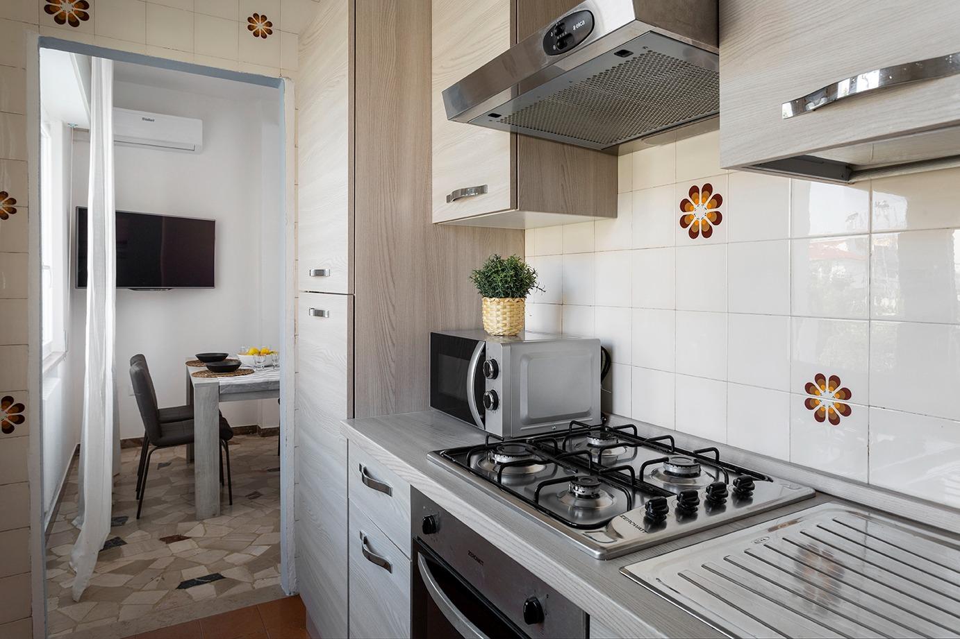 Chaque appartement dispose d'une cuisine entièrement équipée avec une plaque de cuisson, un four traditionnel, un micro-ondes, un réfrigérateur avec congélateur et une bouilloire, ainsi qu'un coin repas et un espace salon pour des moments de détente. La salle de bain privative est dotée d'un bidet et d'un sèche-cheveux, offrant tout le confort nécessaire pour des séjours courts ou longs.