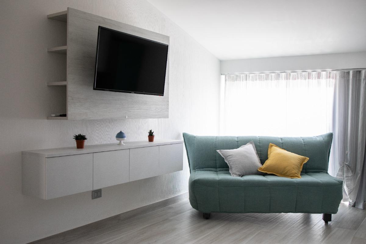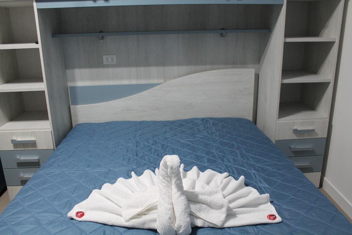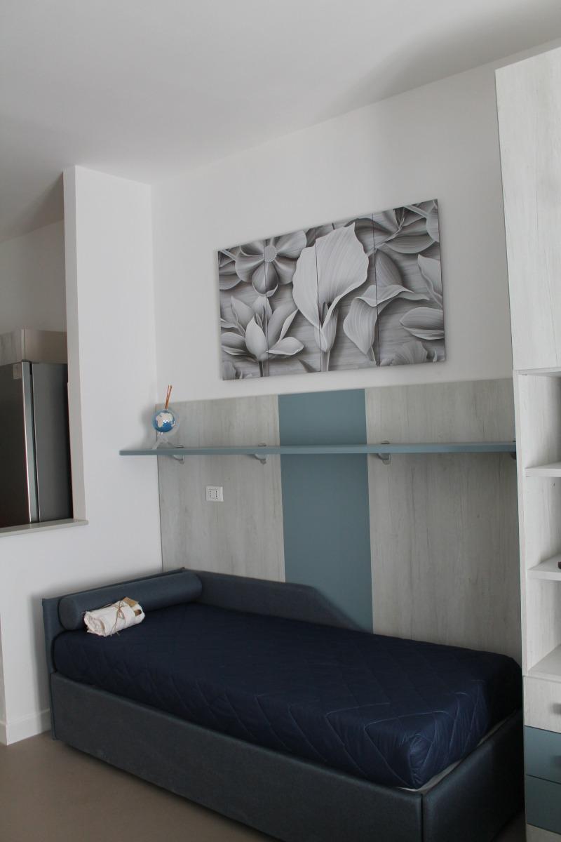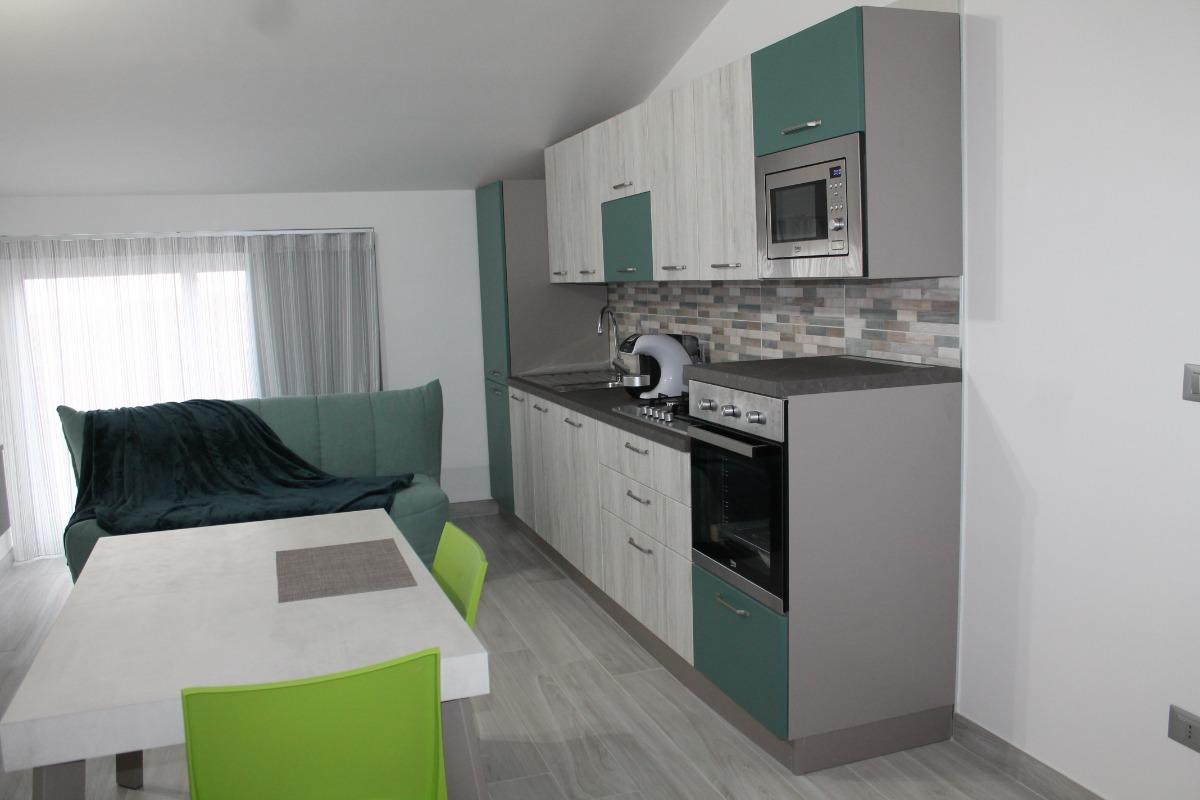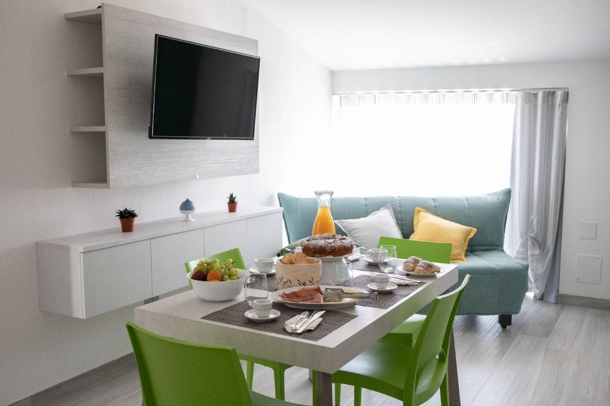 The Ardesia apartment, situated on the ground floor, includes a living area with a kitchenette, a double bedroom, a single room, and a bathroom with a spacious shower. The modern and functional furnishings include a memory foam mattress for optimal rest.