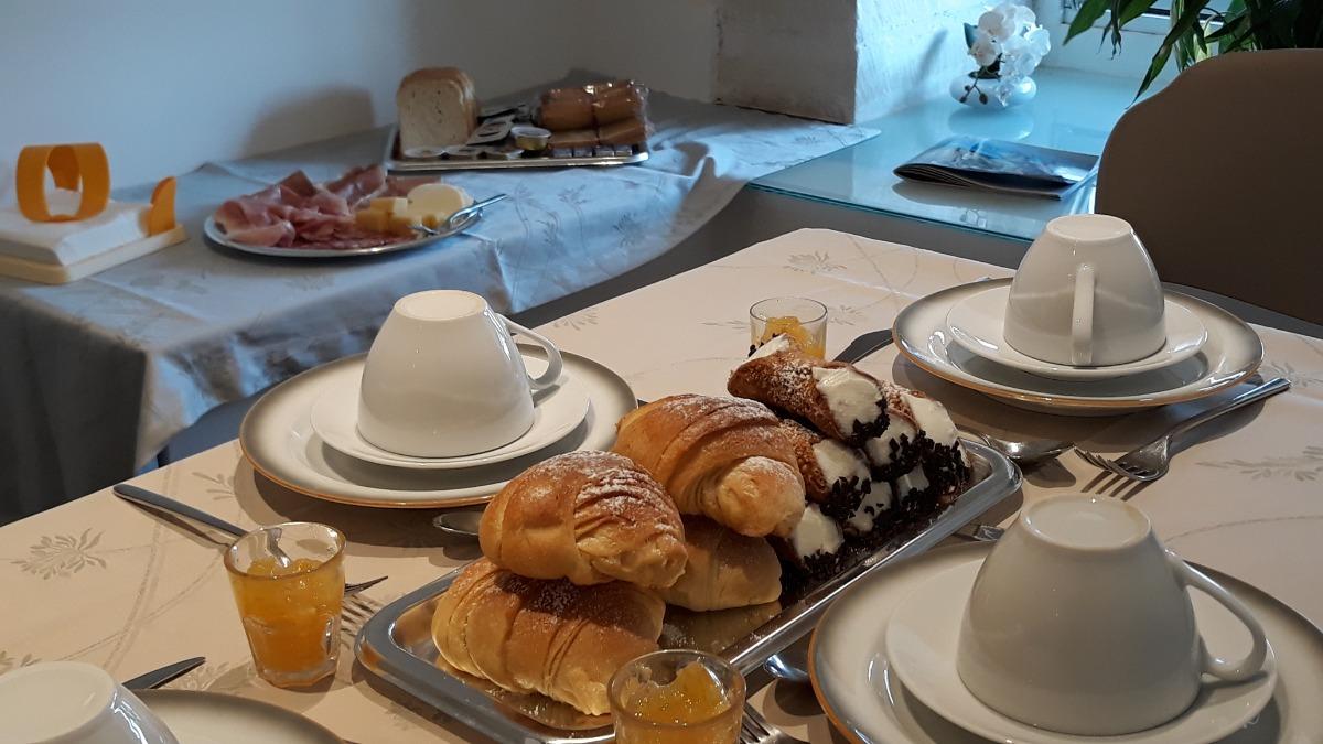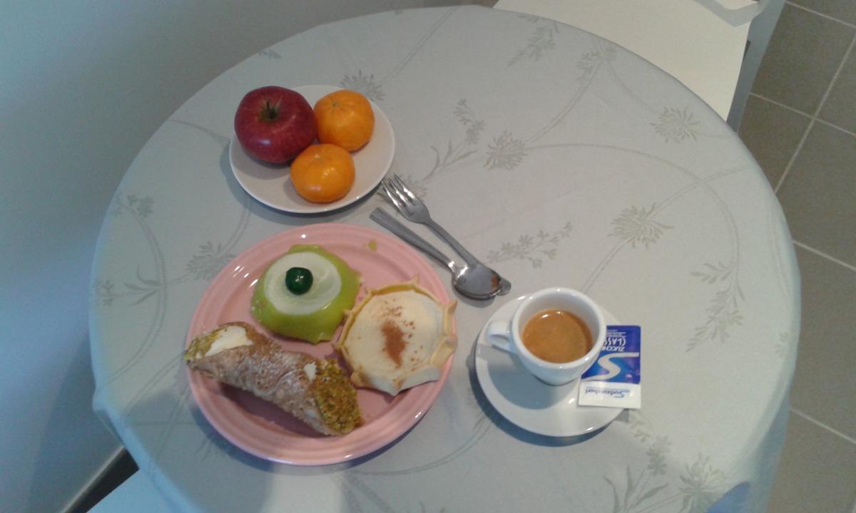 La colazione è servita in una saletta luminosa e confortevole. Oltre al classico caffè, tè o latte, affiancato da biscotti e cornetti, che potrete scegliere, la nostra struttura è lieta di offrirvi cibi tipici della tradizione siciliana (cannoli, cassatine), frutta di stagione ed anche la colazione continentale su richiesta.