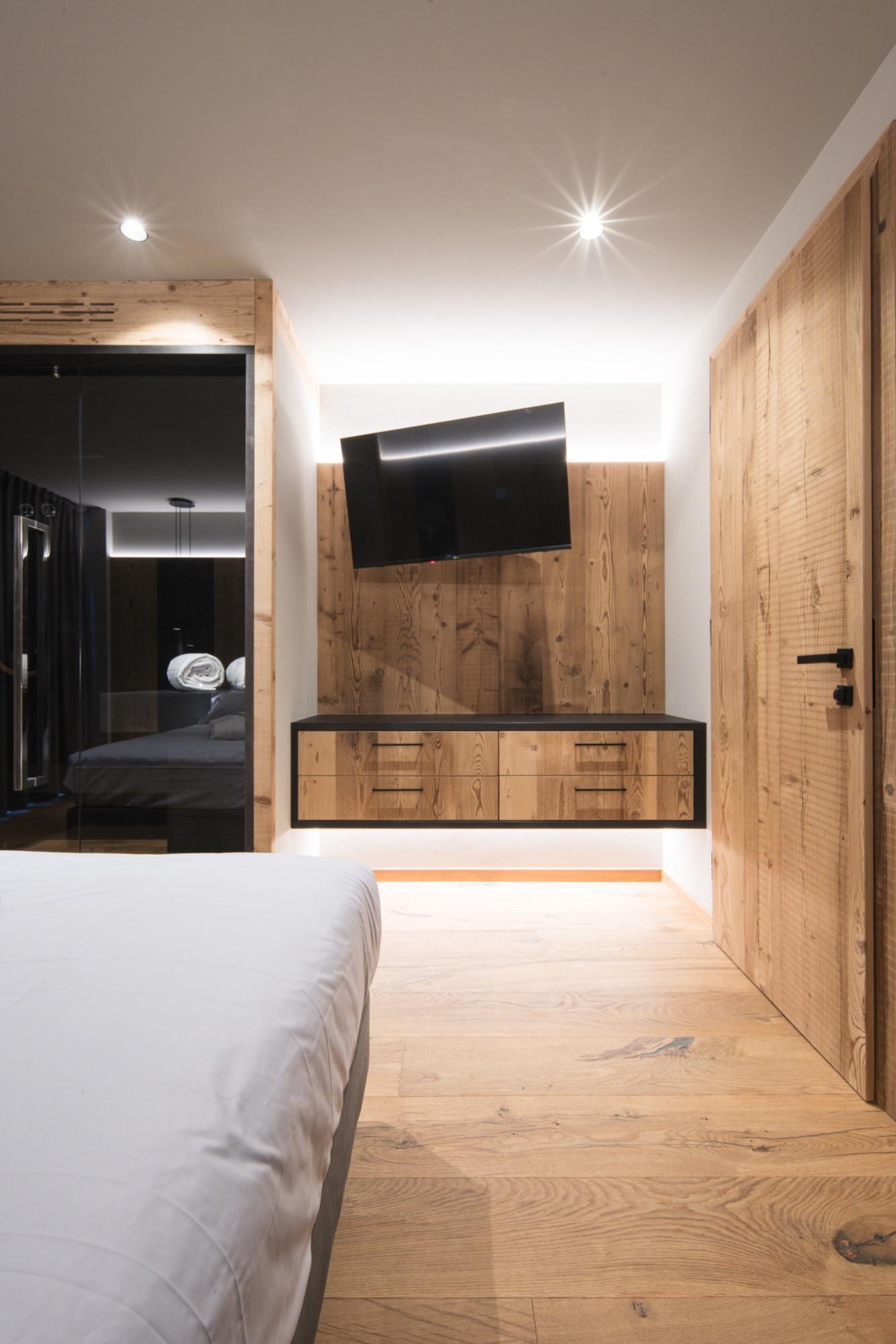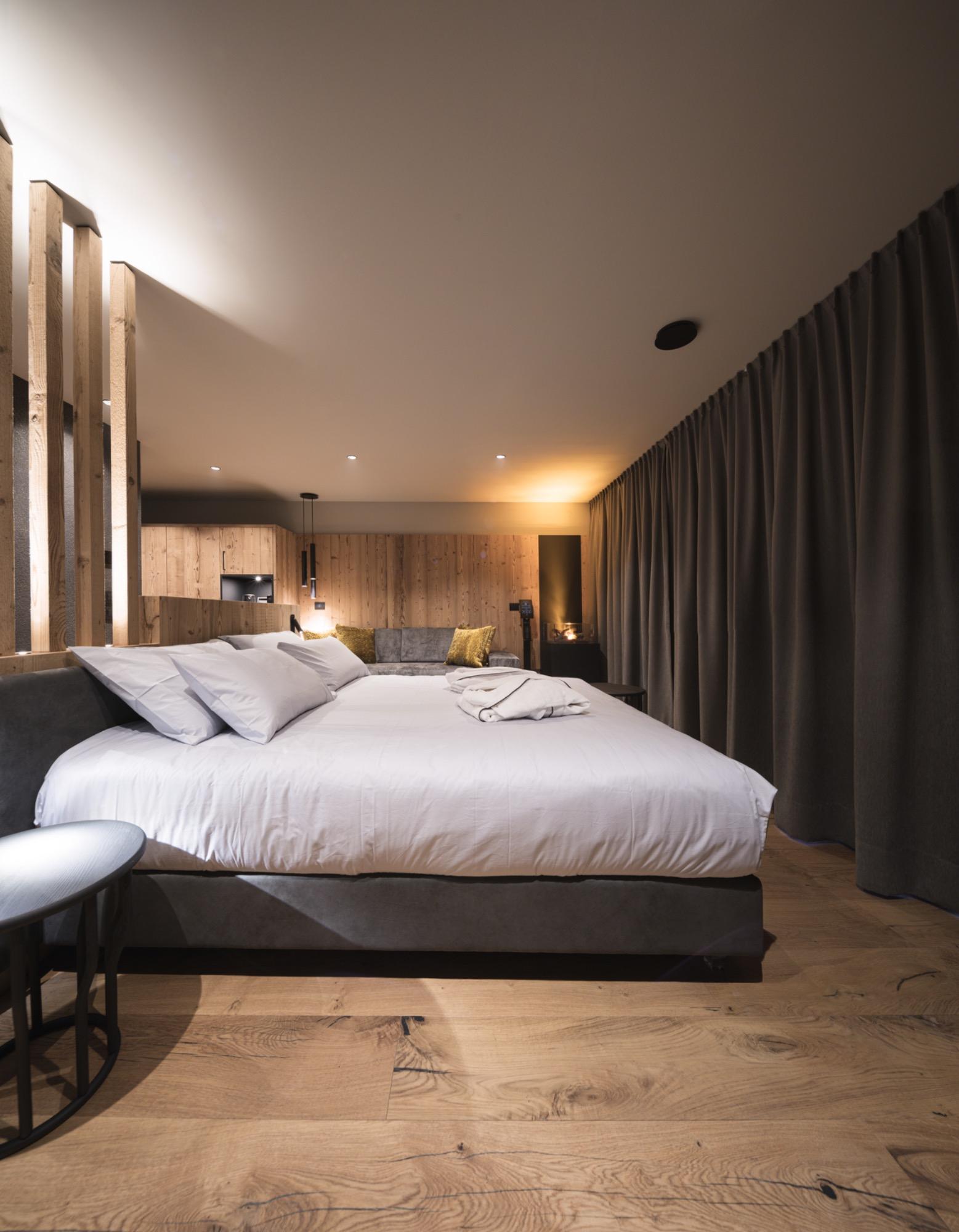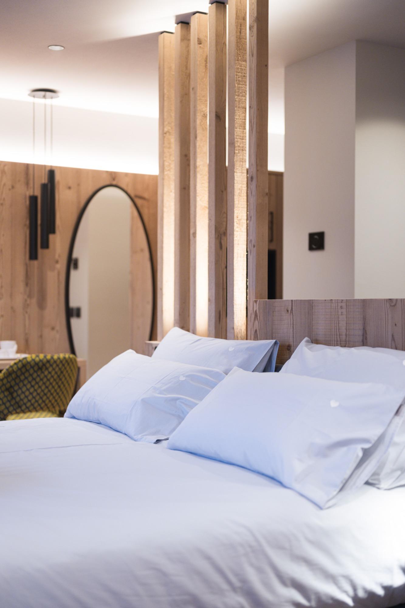 Le suite, tutte al primo piano, si affacciano sulle vette dolomitiche e sono arredate con materiali naturali, come legno di recupero e travi antiche, che creano un’atmosfera calda e raffinata. Ogni camera è dotata di sauna finlandese privata Starpool, Wellness Coach per percorsi guidati di benessere, caminetto ad acqua, minibar fornito, macchina da caffè, doppio cuscino ergonomico e un set di cortesia firmato Le Frette e John Richmond. Al risveglio, una colazione à la carte in stile “mountain” delizia gli ospiti con dolci, frutta e prodotti locali serviti in un ambiente moderno e accogliente.