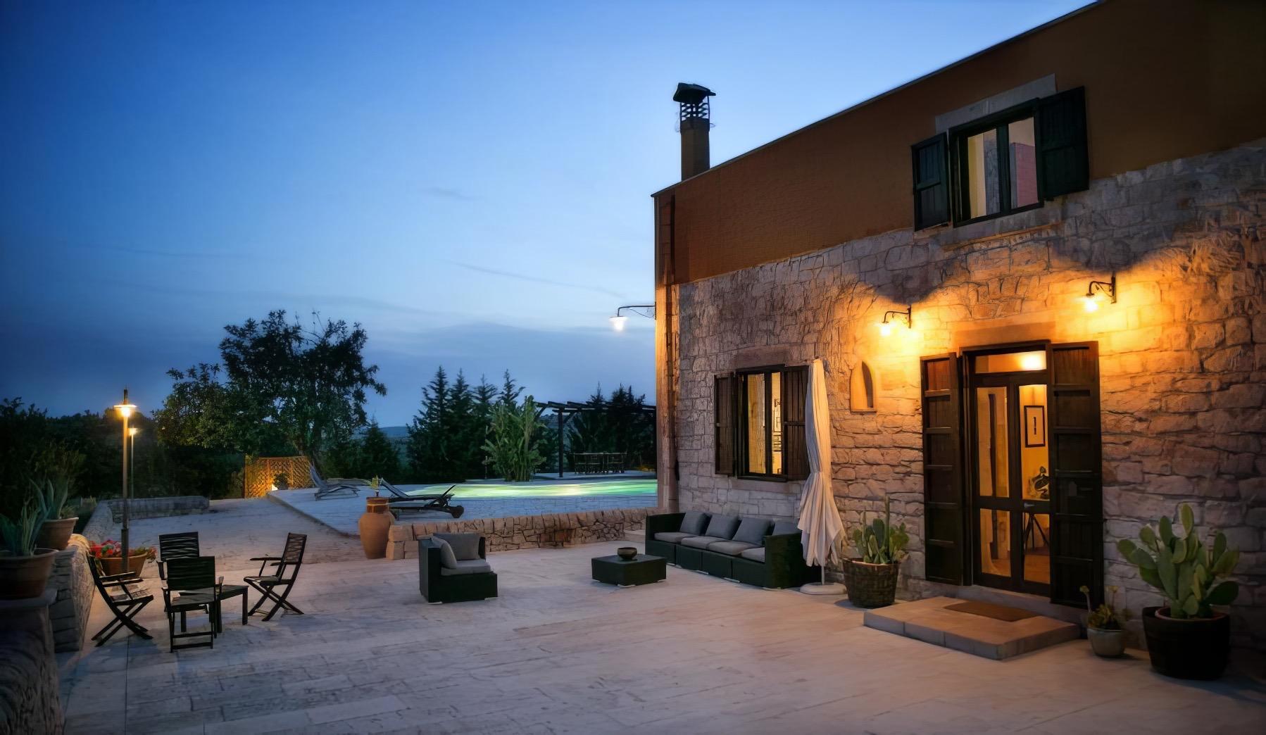 The villa features a total of five rooms that elegantly evoke the refined style of 20th-century Sicily, designed to provide maximum comfort: wooden-beamed ceilings, private bathrooms, air conditioning, and Wi-Fi. The panoramic pool includes a hot tub area, a children’s section, and a spacious sun deck with loungers and gazebos, perfect for enjoying an aperitif at sunset.