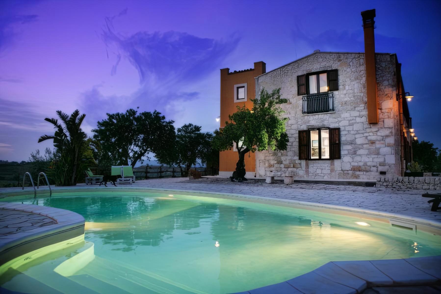 Nestled among the hills surrounding Noto, Villa Zammarra welcomes its guests in an ancient family estate transformed into a charming residence. The breathtaking landscape steals the show: from the terraces and the pool, one can gaze out and see the Mediterranean and Ionian seas embraced in a single view. Surrounding the villa, six hectares of countryside cultivated with almond trees, olive groves, and carob trees create a tranquil atmosphere, occasionally interrupted by the song of cicadas on summer days.