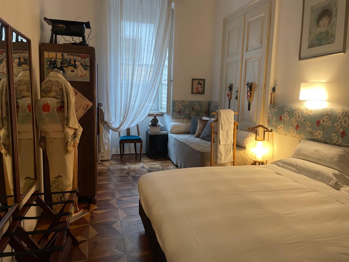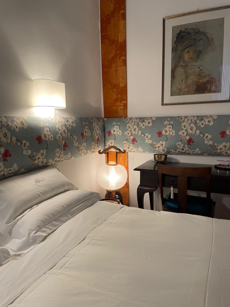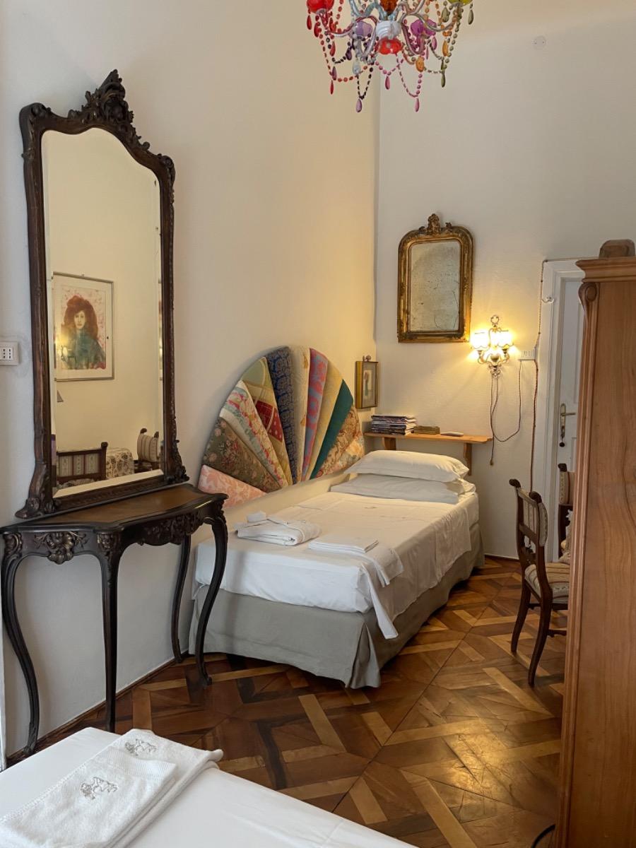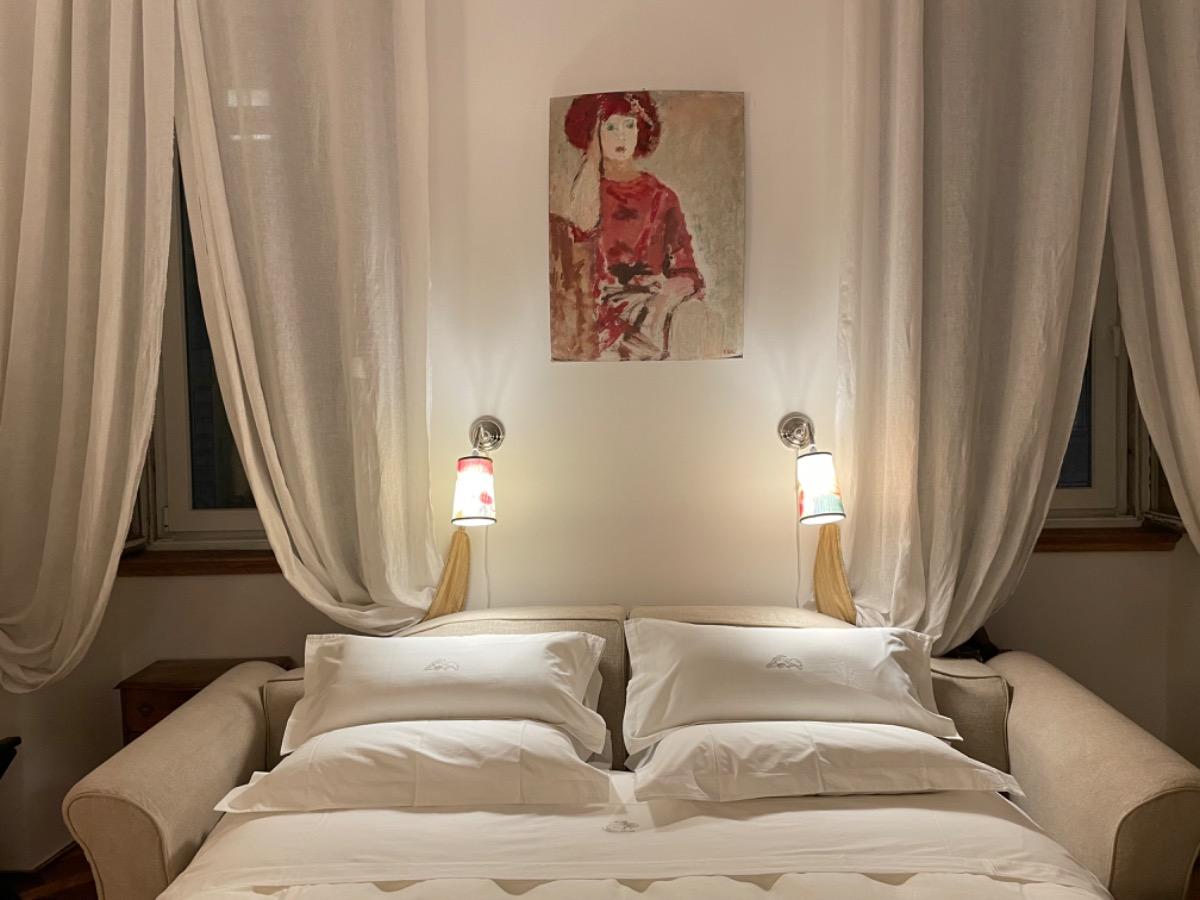 The rooms are equipped with soundproof windows and comfortable beds with double pillows, ensuring a restful sleep. You can wrap yourself in embroidered sheets made of fine Egyptian cotton and cover yourself with soft goose feather duvets, immersing yourself in a timeless atmosphere surrounded by the artworks of Lidia Polla and theatrical details in the decor.