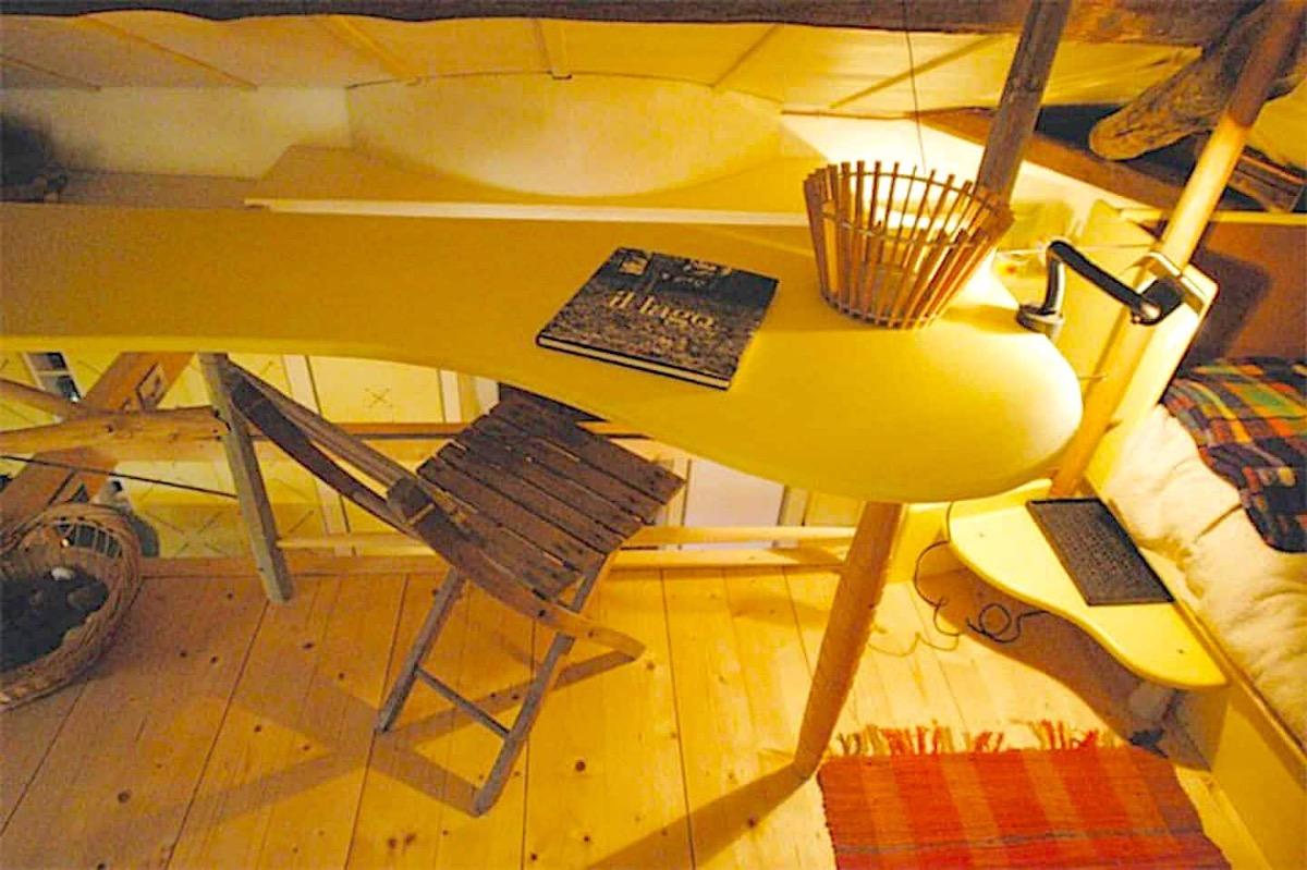 Baubaus house è stata interamente progettata e realizzata da mio marito Giorgio, artista artigiano. Protagonista il legno che ben si sposa nei dettagli con altri materiali, preziosi come le tesserine di vetro di Murano o il cuoio, fino alle divertenti agrette in metallo. Un piccolo spazio da godere e scoprire in totale relax.
