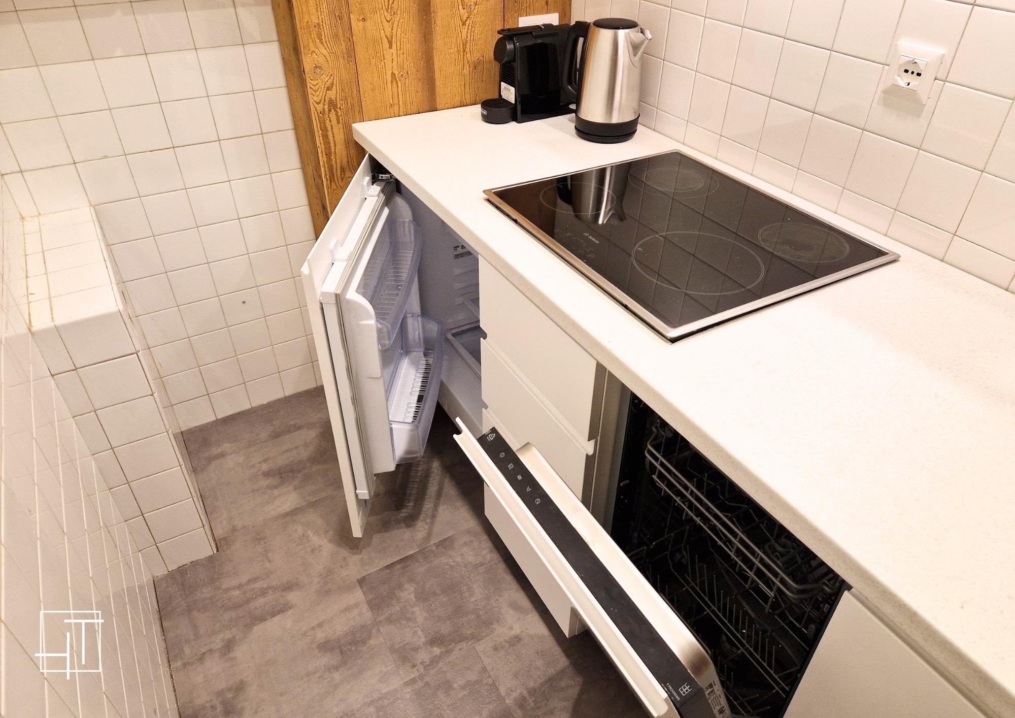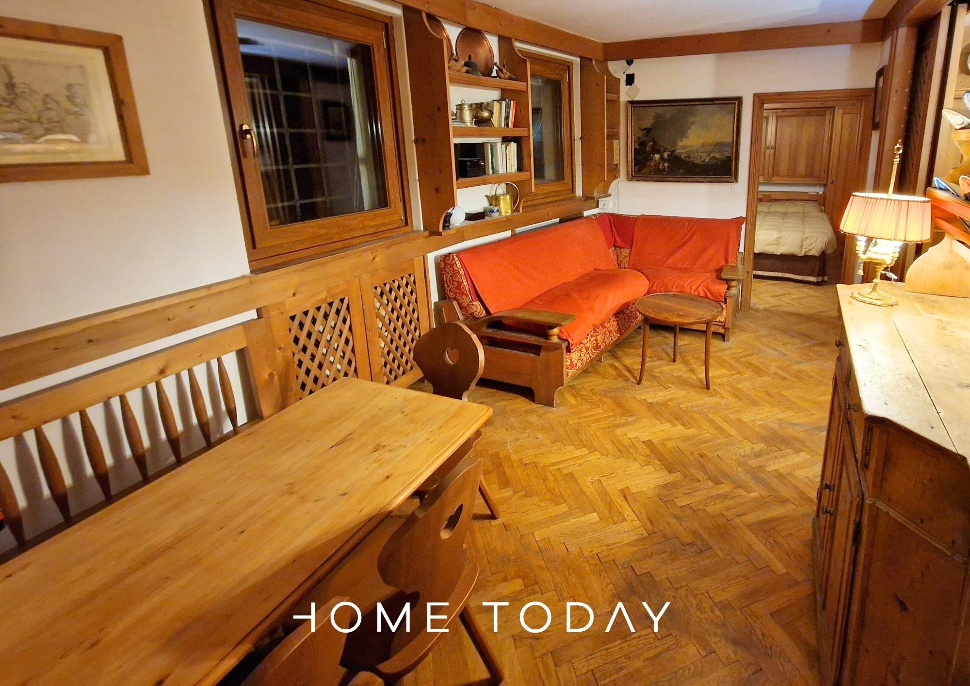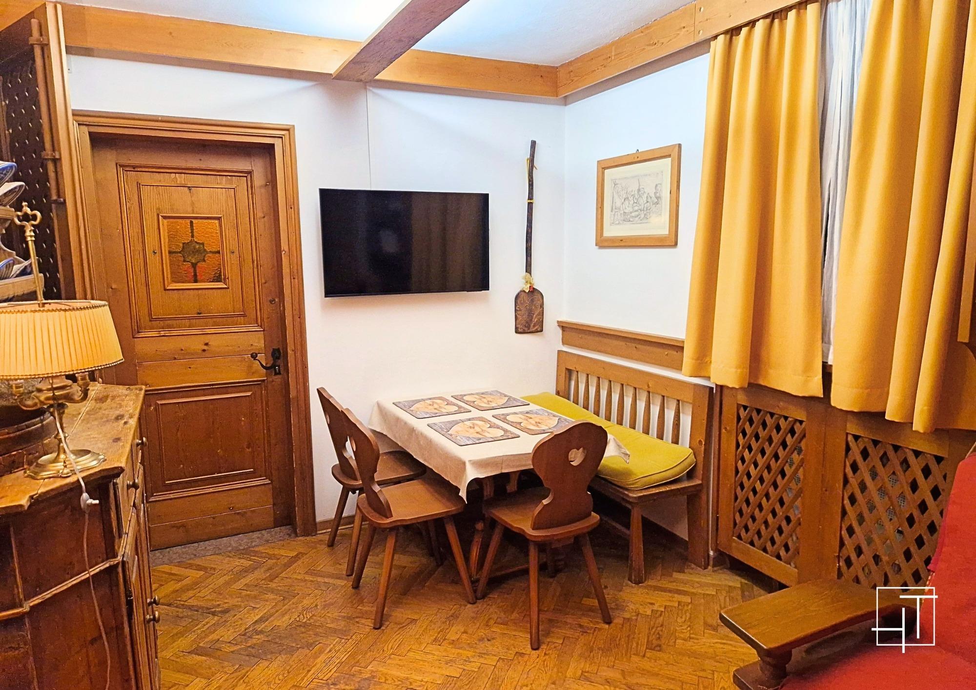 La zona giorno, luminosa e interamente rivestita in legno, è il fulcro della casa: un ampio soggiorno con tavolo da pranzo, divano angolare e Smart TV, ideale per condividere momenti di relax dopo una giornata sulle piste o tra le vie del centro. La cucina, moderna e completamente attrezzata, dispone di piano a induzione, forno a microonde, frigorifero con freezer, lavastoviglie e macchina del caffè, offrendo tutto il necessario per un soggiorno indipendente.