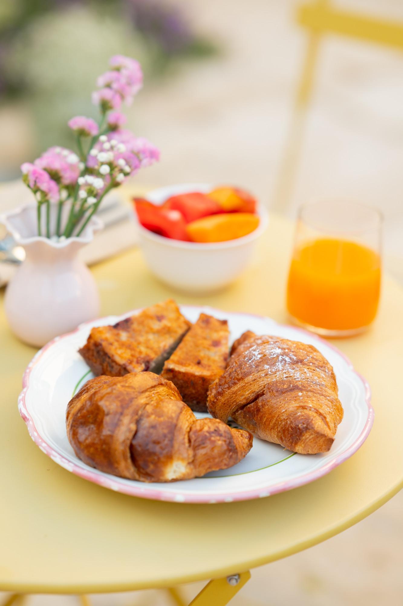 The day at Corte Barra begins with breakfast served directly in your room, elegantly presented under refined cloches for a cozy and private awakening. The menu includes freshly brewed coffee, milk, warm croissants, yogurt, seasonal fresh fruit, and a carefully prepared cake, all evoking the typical flavors of Mediterranean tradition and providing a moment of enjoyment and relaxation before setting out to explore the area.