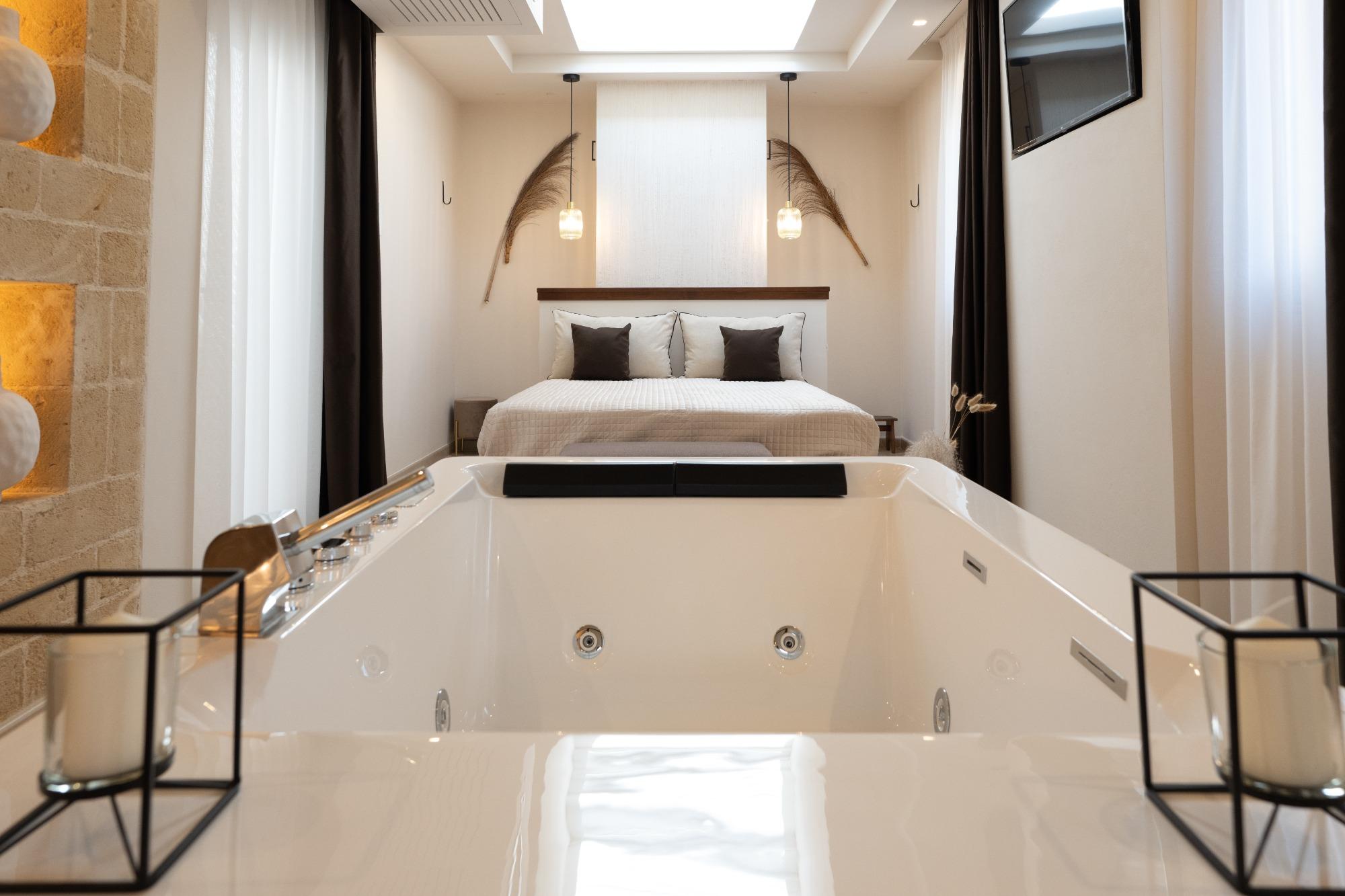 Breakfast is served directly in the room under elegant cloches, offering Mediterranean specialties such as coffee, milk, croissants, fresh fruit, yogurt, and homemade cakes, providing an intimate and delightful start to the day. Guests also have access to electric car charging and parking right in front.