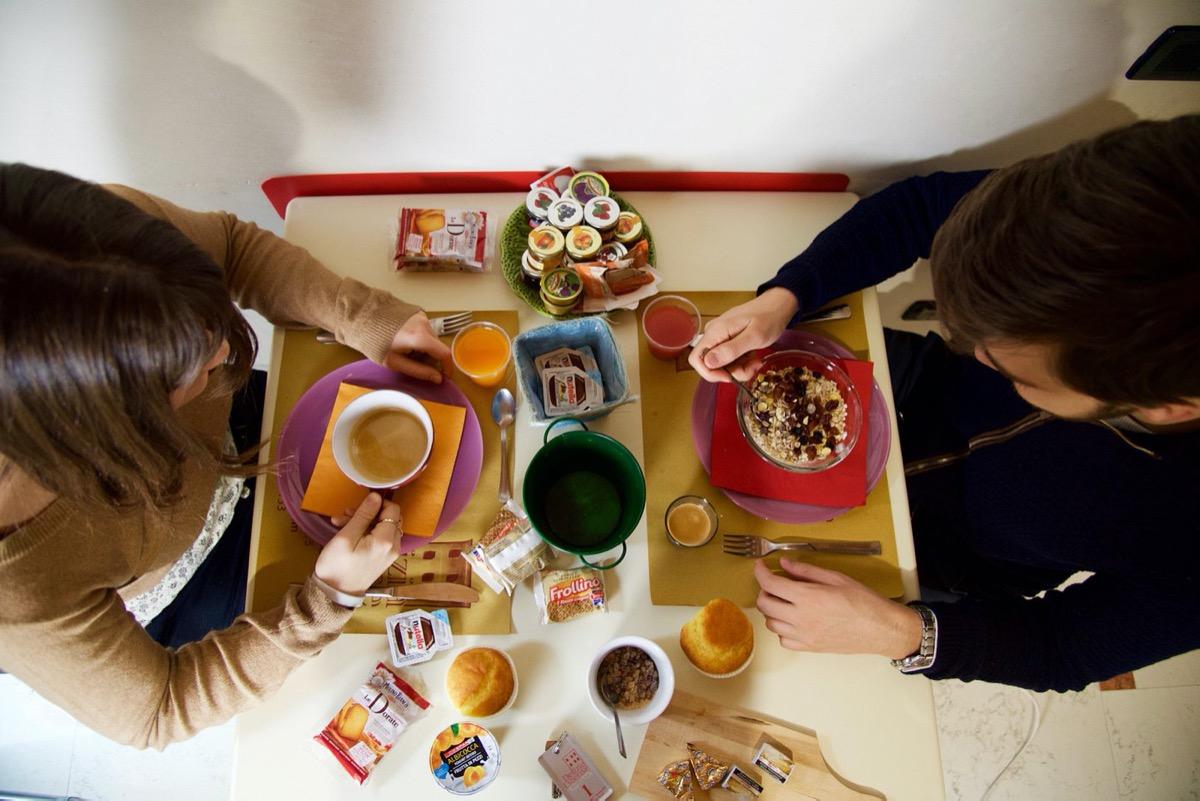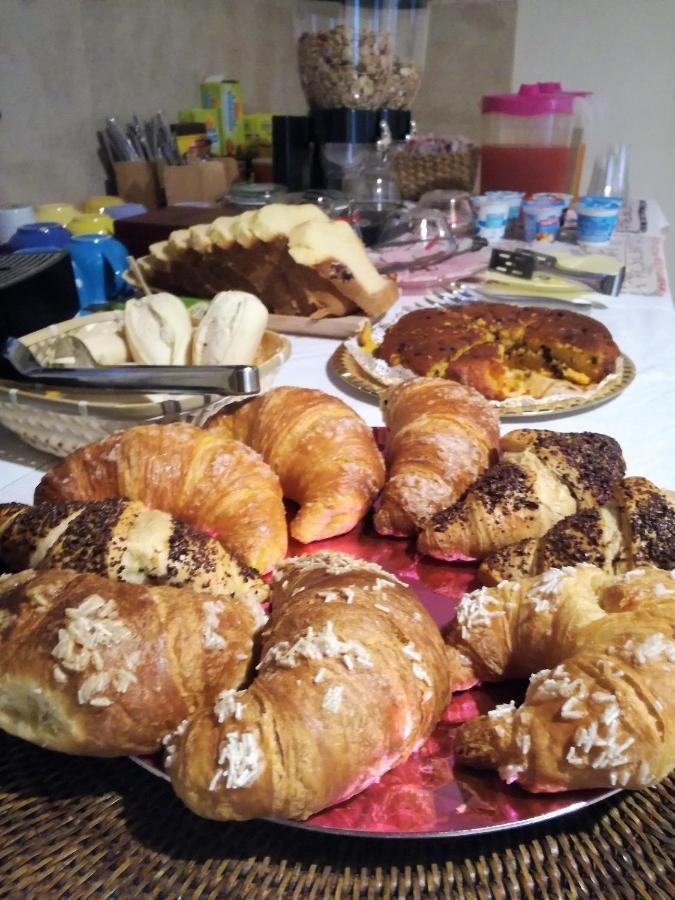Breakfast is served in a small room and is a buffet-style (self-service). During the summer season, guests can also enjoy the inner courtyard. We offer an Italian breakfast consisting of croissants, biscuits, single-portion jams, corn flakes, muesli, muffins, bread, yogurt, ham, and cheese. We also have a dedicated corner for guests with gluten intolerance, where we provide packaged products. In addition, we have a coffee machine, cappuccino, tea, and hot milk.