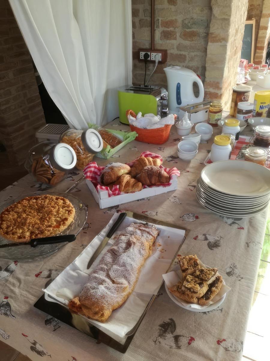 In the morning, you can enjoy our typical Mediterranean breakfast, consisting of milk, coffee, and jams. Additionally, you will have the opportunity to savor our delicious homemade pastries and taste the fresh seasonal fruit from the beautiful Marche countryside.