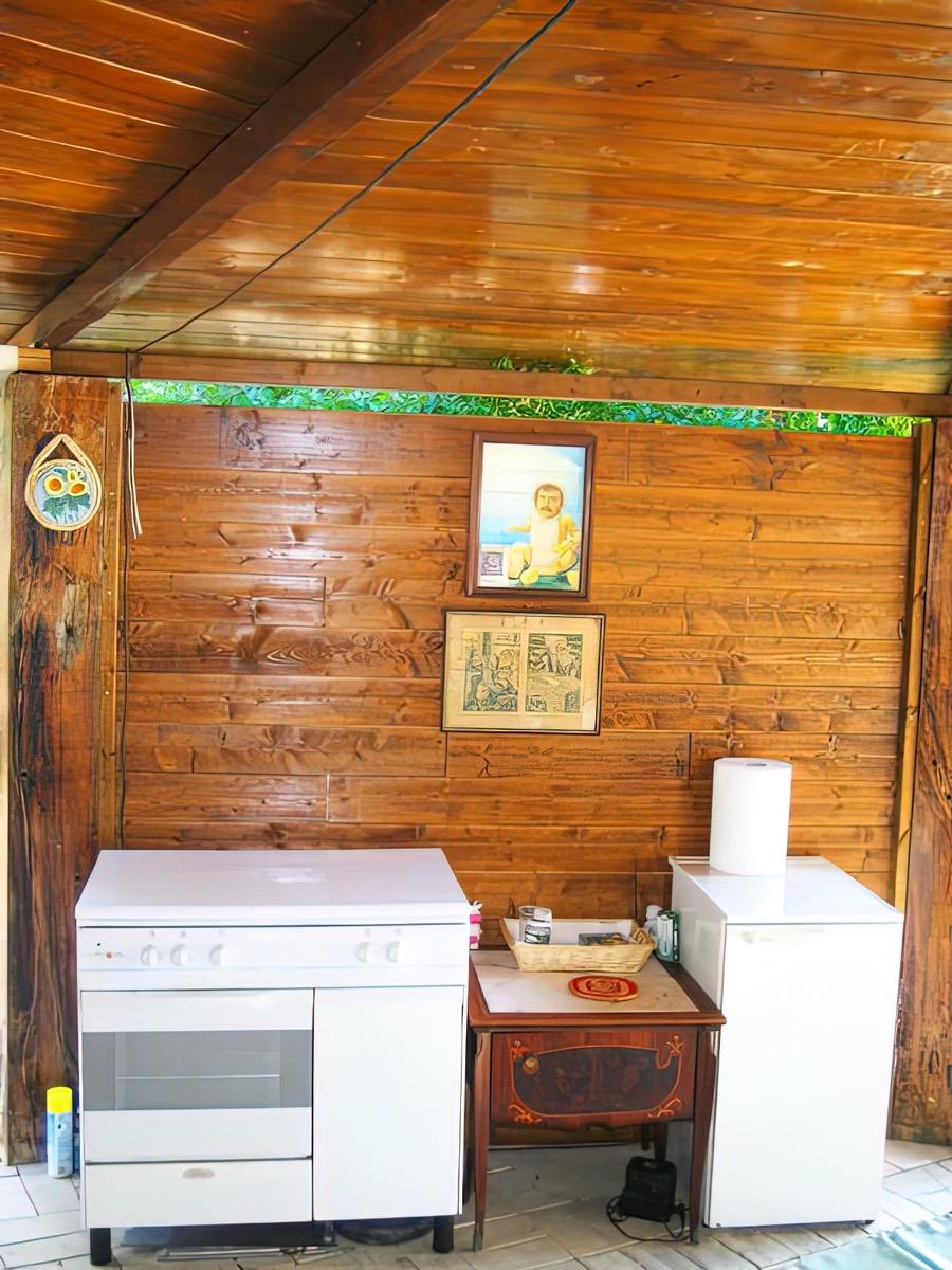There is a communal kitchen area at the gazebo, which includes an oven and gas stove, a refrigerator, and a barbecue.