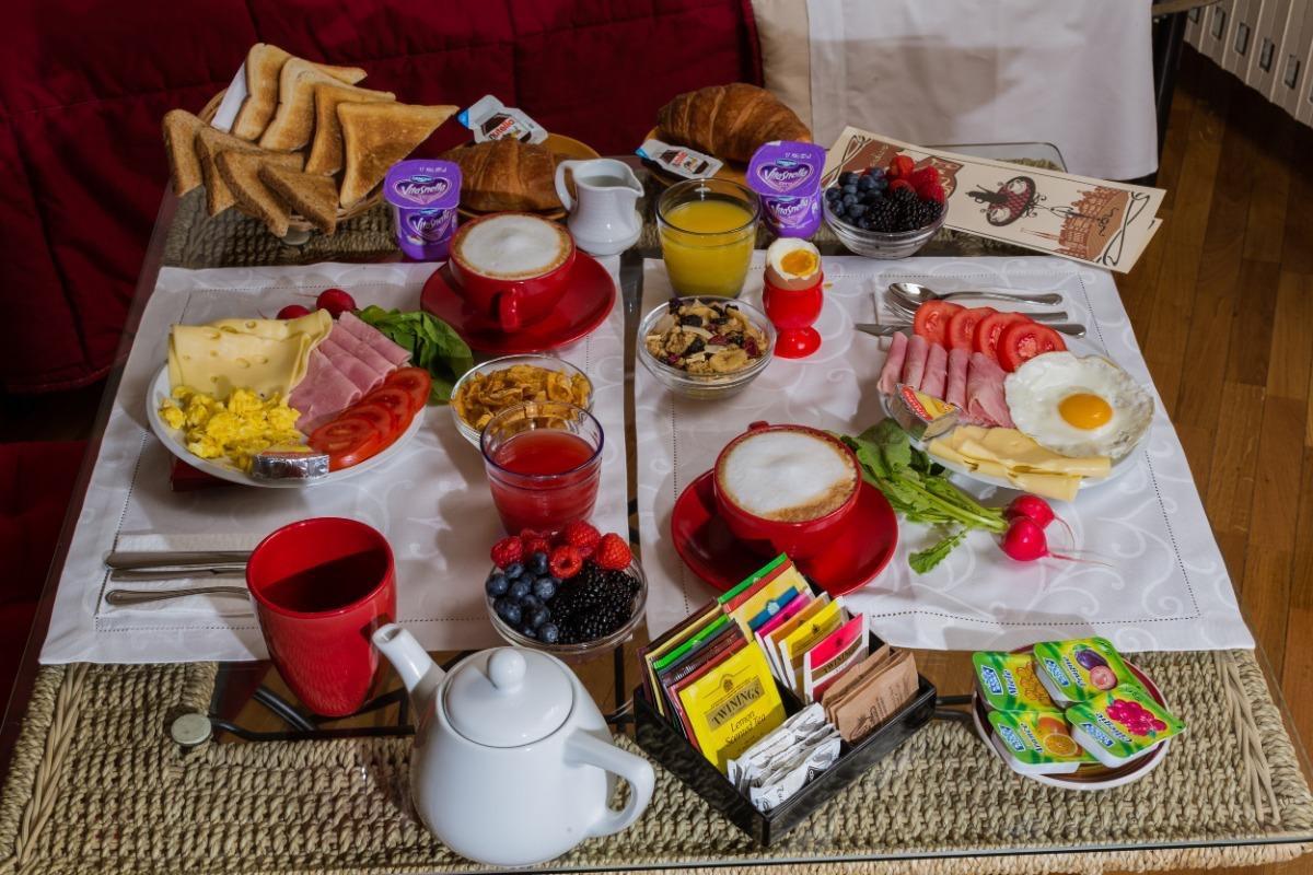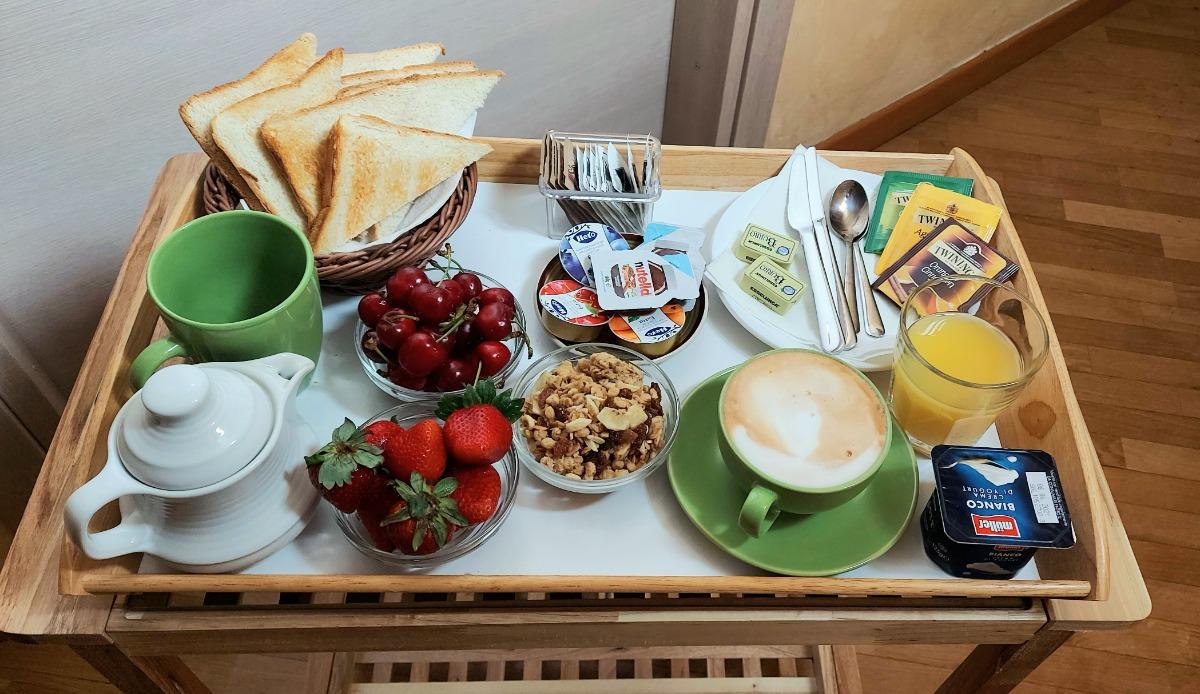Breakfast is served every morning in your room from 8:00 to 10:00, and it offers a variety of delights, including: fresh pastries (no frozen ones!) such as croissants, jam and Nutella, yogurt (fruit or plain), cornflakes, muesli, butter, honey, toast (white or whole wheat), Italian espresso coffee, American coffee, caffe latte, cappuccino, hot chocolate, pancakes with maple syrup, fresh seasonal fruit, orange juice (yellow or red), pineapple juice, apple juice... and also boiled, scrambled or sunny-side-up eggs, cooked ham, salami, and cheese.