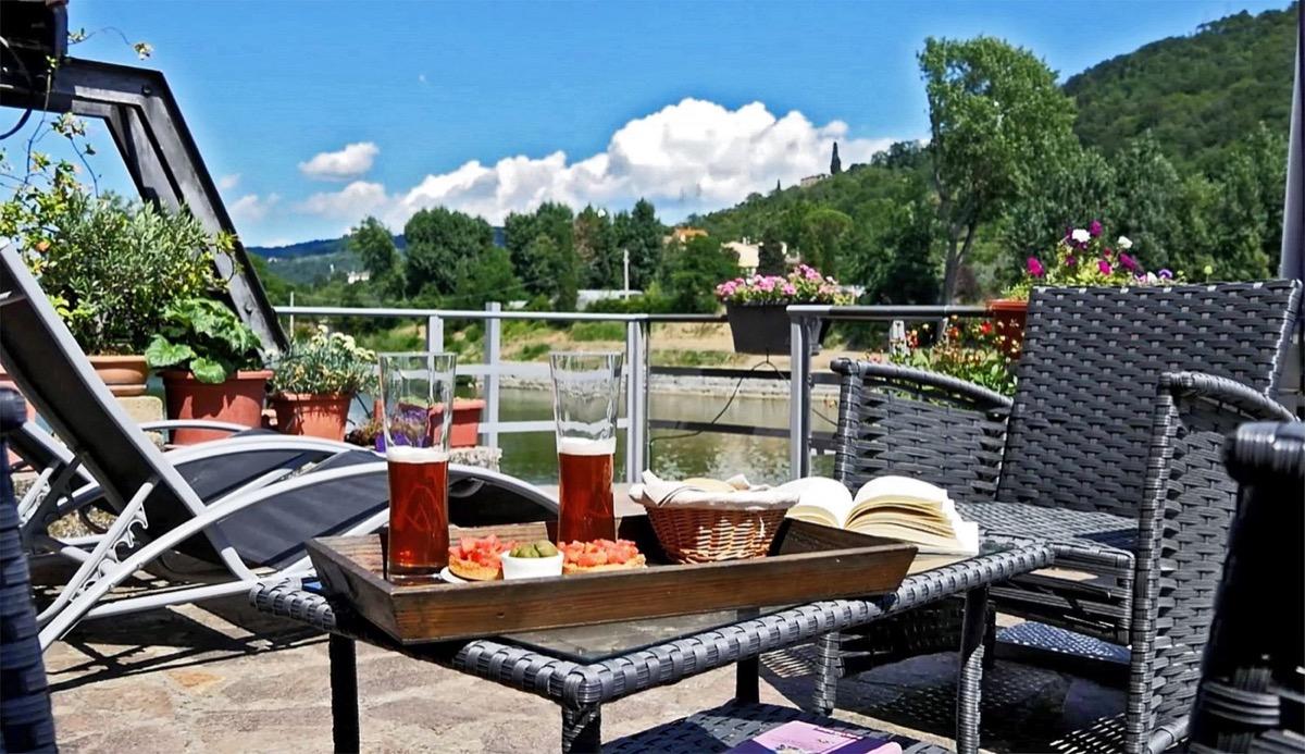 There are large outdoor spaces equipped with a garden and a terrace that overlooks the river. Breakfast is served in the garden.