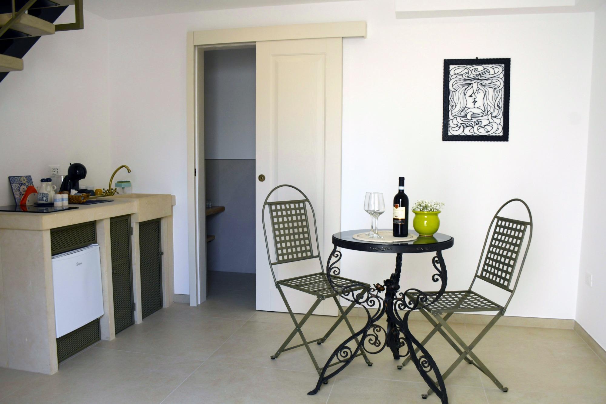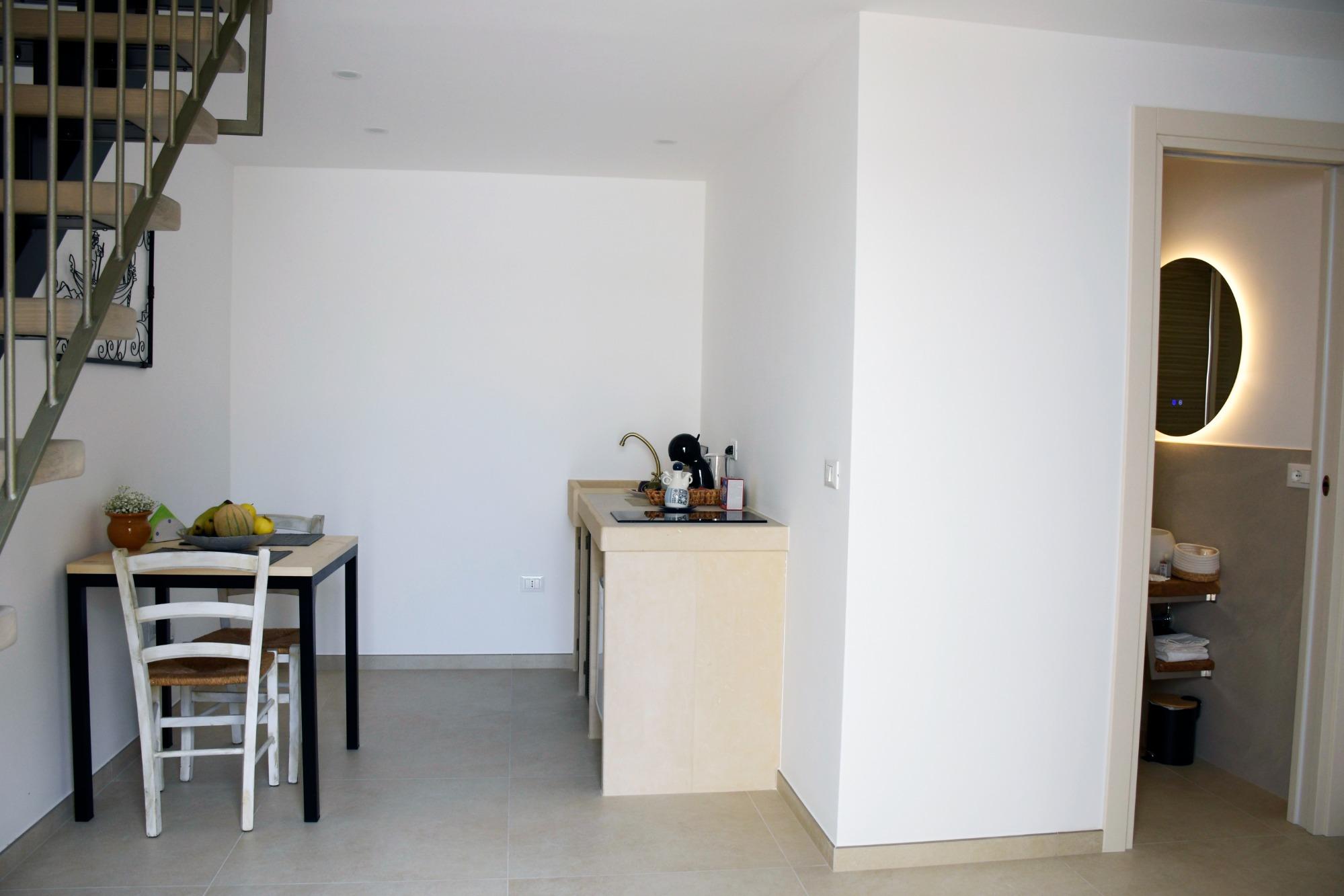 The rooms, each with an independent entrance leading to a furnished courtyard, feature a well-equipped kitchen, a private bathroom with a spacious shower, air conditioning, Wi-Fi, and a lofted sleeping area. These spaces are designed to offer maximum privacy and tranquility, set in a context that retains the authenticity of the village and the simplicity of genuine experiences. Breakfast is served at a nearby partnered café, and discounts for boat excursions to the caves of Leuca are available upon request.