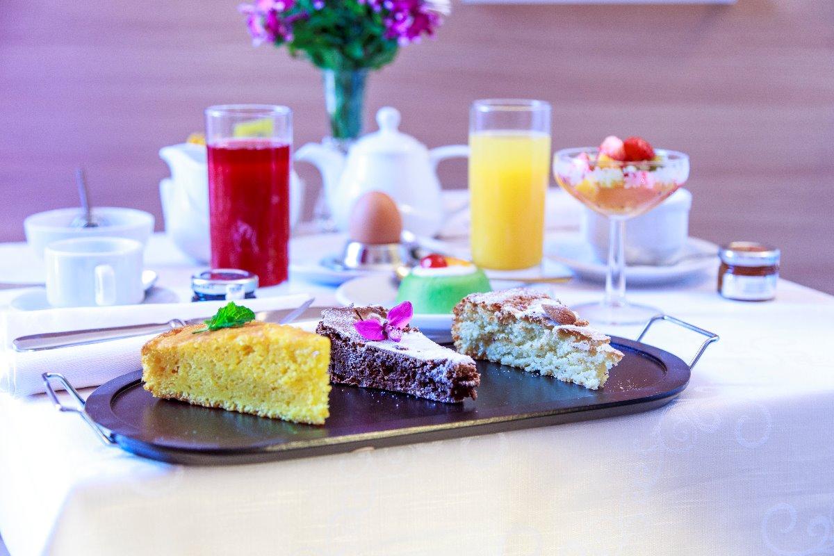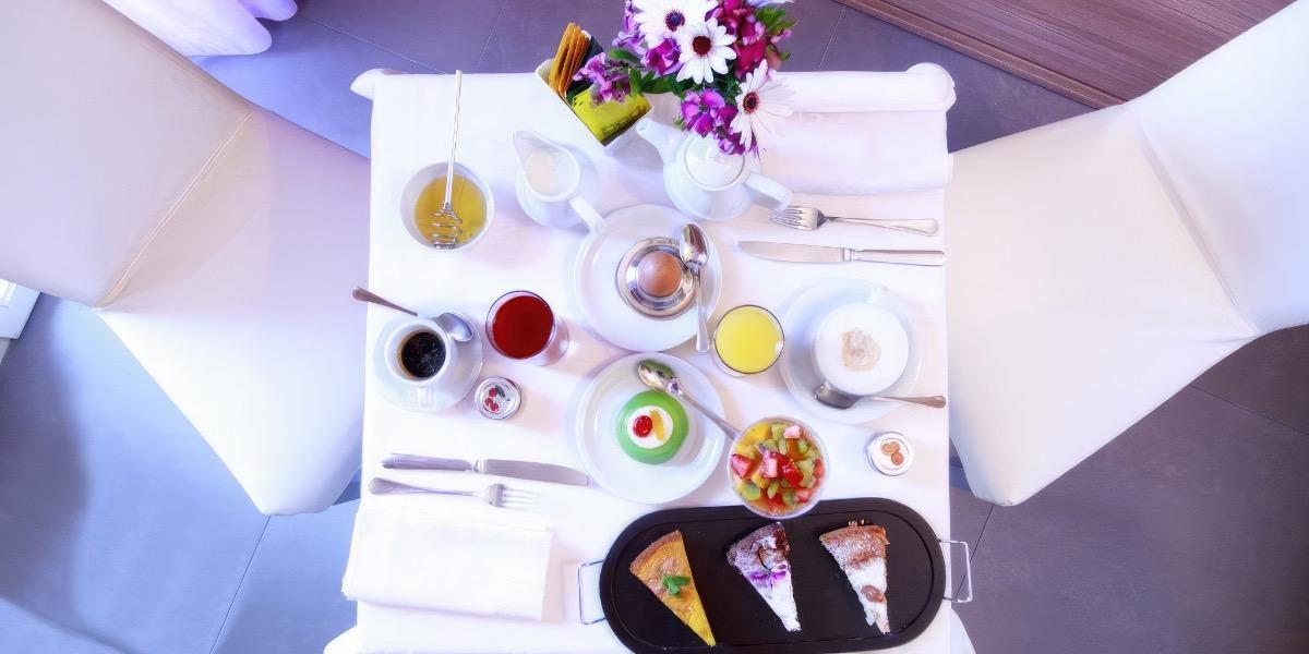 During the spring and summer seasons, breakfast is served in the garden. A plentiful buffet is available, including sweets, cookies, croissants, cakes, fruit juices, yogurt, freshly squeezed juices, seasonal fresh fruits, jams, honey, butter, milk, cappuccino, tea, espresso, American coffee, brioche, bread, and toast. Upon request, a continental breakfast with eggs, bacon, cold cuts, and cheese is also available.