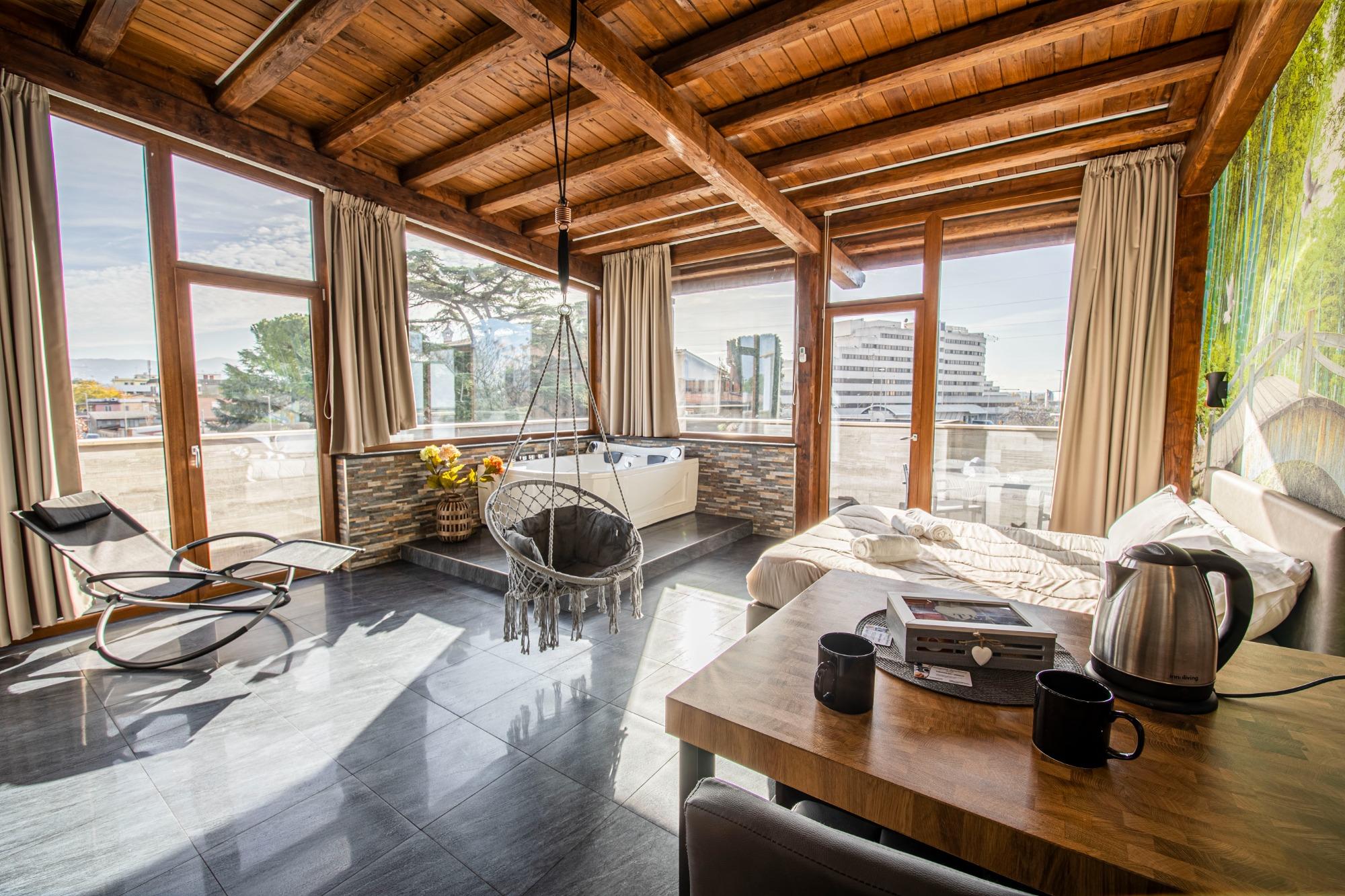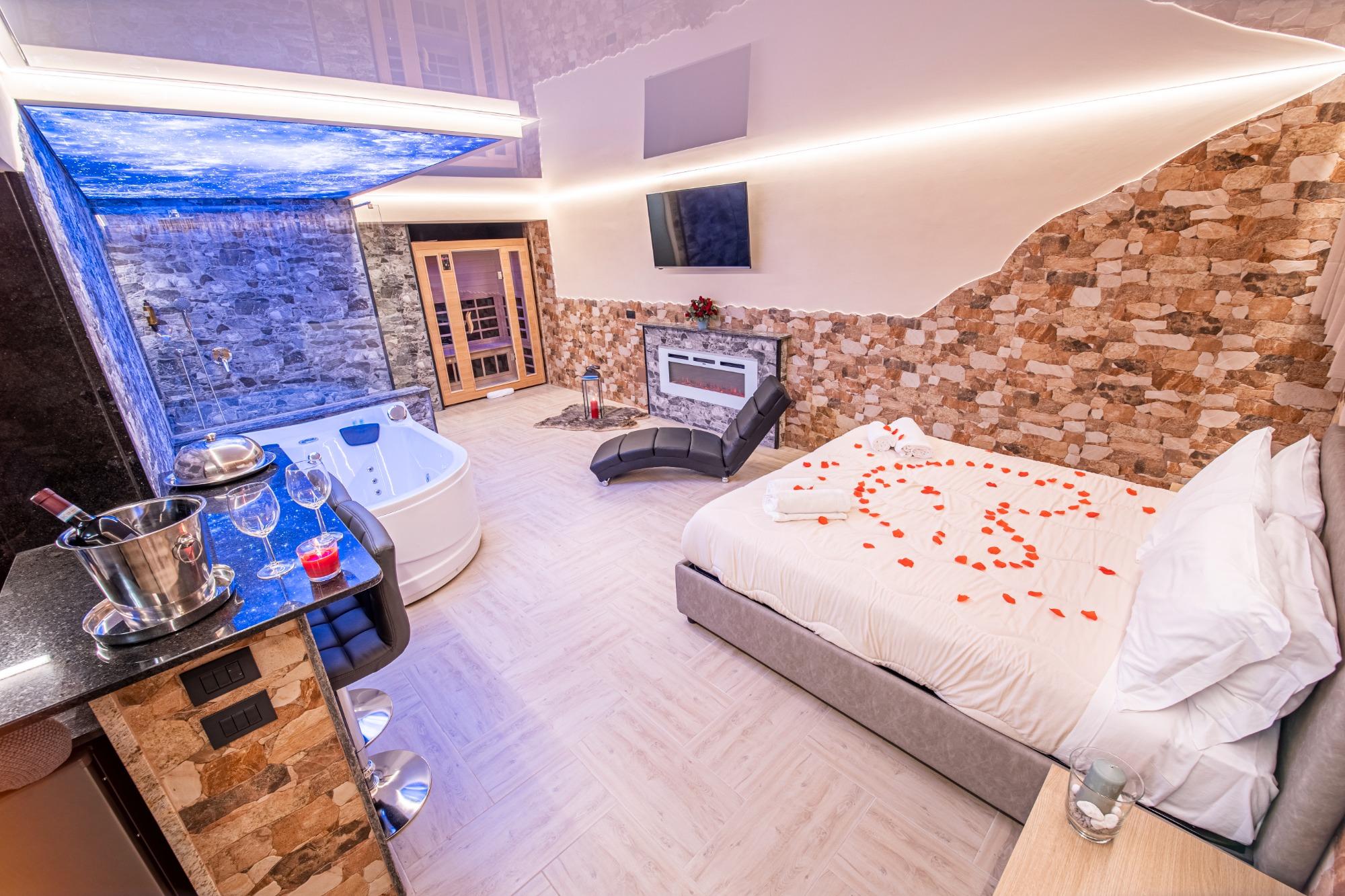 Our themed suites offer unique and captivating spaces, ideal for those seeking an extraordinary experience. The Cave Suite envelops you in an underground landscape illuminated by a myriad of reflections, while the Forest Suite offers the tranquility of a painted woodland, caressed by the gentle sound of water. The Chalet Suite, inspired by a mountain retreat by the lake, enchants with its natural charm, and the Passion Red Suite invites you to indulge in a seductive and vibrant atmosphere, surrounded by wine and inviting vibes. All suites are equipped with a hot tub and private sauna for a wellness-focused sensory experience.